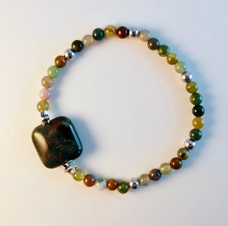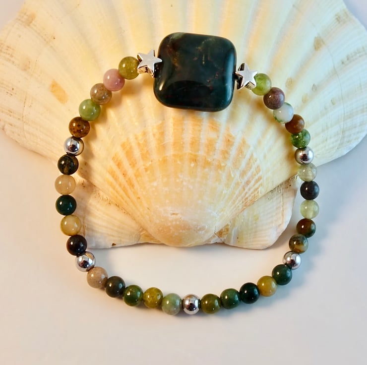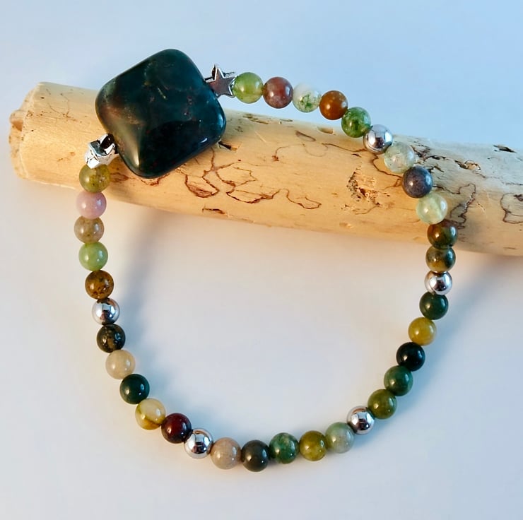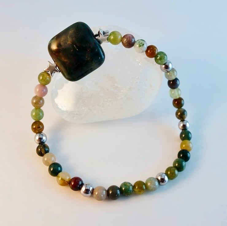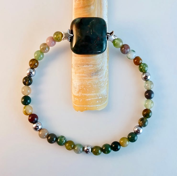The focal bead is a 16mm square, highlighted with a pair of 6mm Tibetan silver stars, set between 4mm beads and embellished with 4mm silver Hematite.
