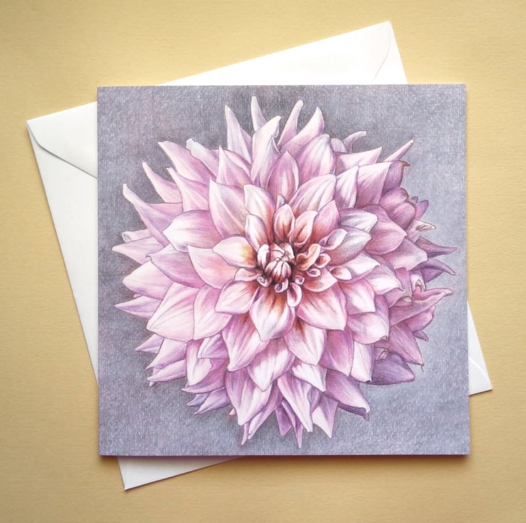 This card is a reproduction of one of my original colour pencil drawings. A single large dahlia bloom fills the image, each petal detailed in shades of pink and purple with deep burnt oranges near the centre.