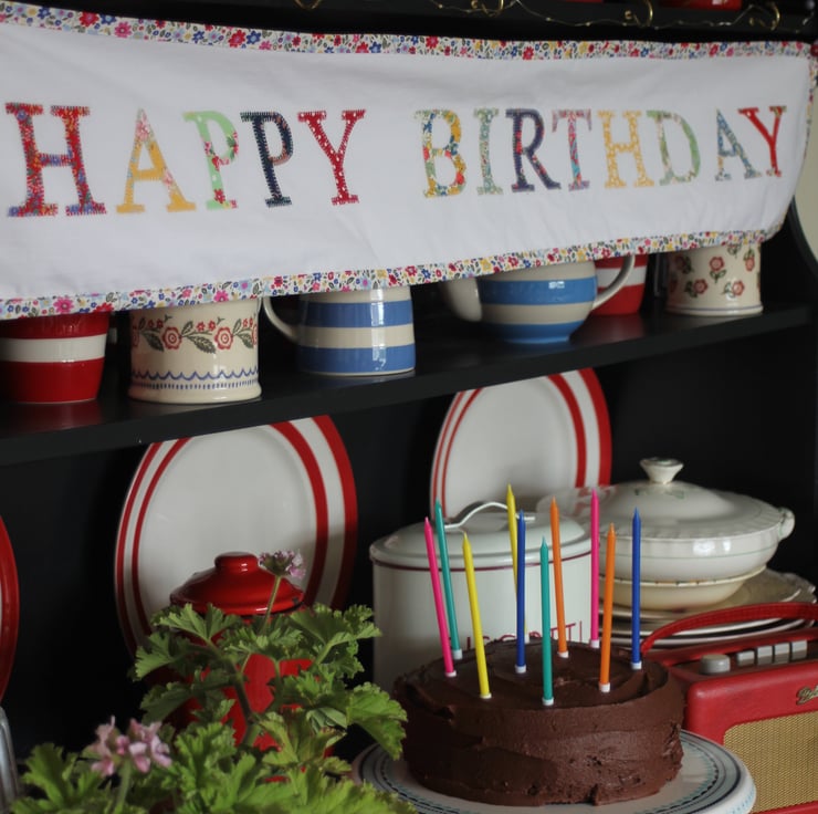 The banner has been created from white vintage cotton and features the wording 'Happy Birthday'. The lettering has been cut by hand and then machine-appliqued in place. It is edged in a co-ordinating red, yellow, blue and green floral bias binding and has two hanging loops at the top with a button trim. The banner is backed with the same white cotton fabric.