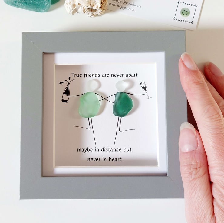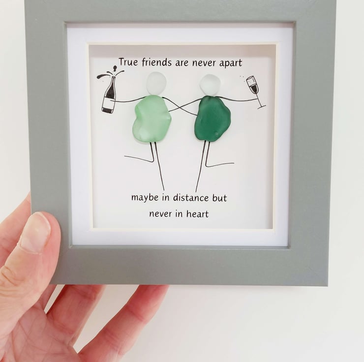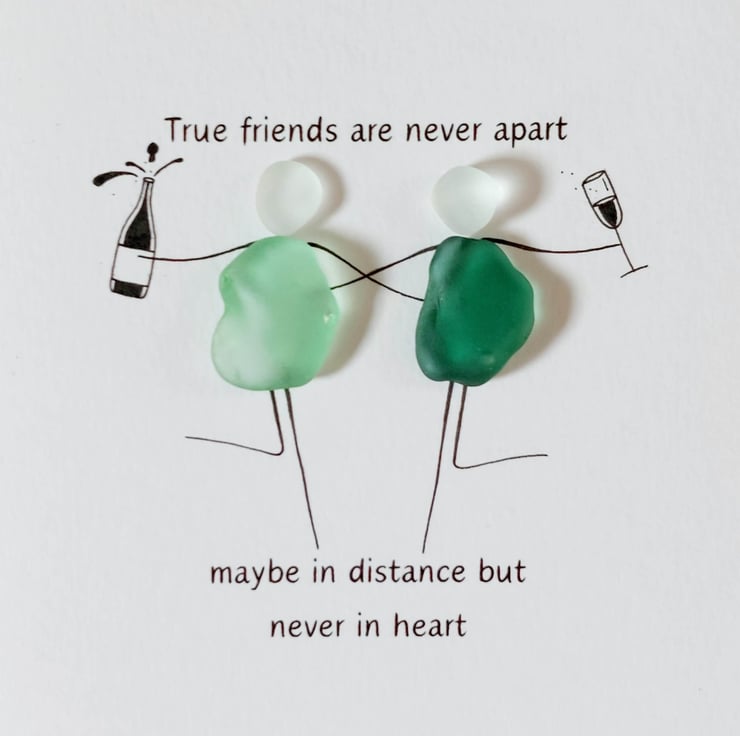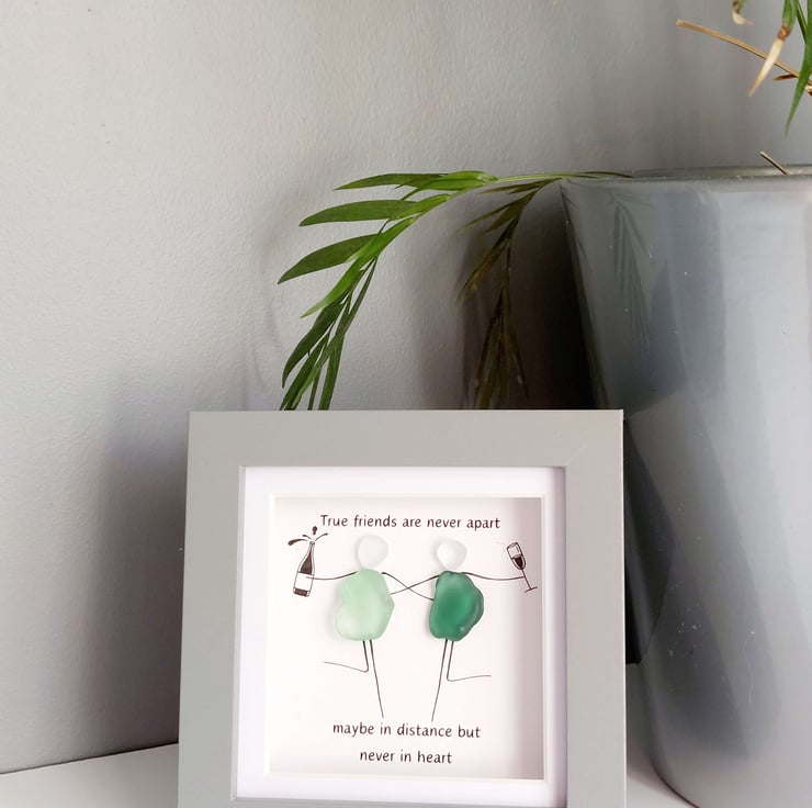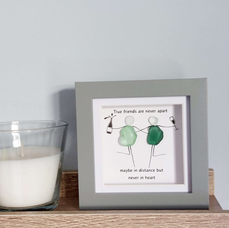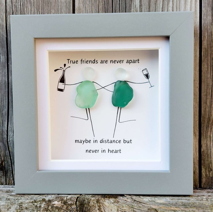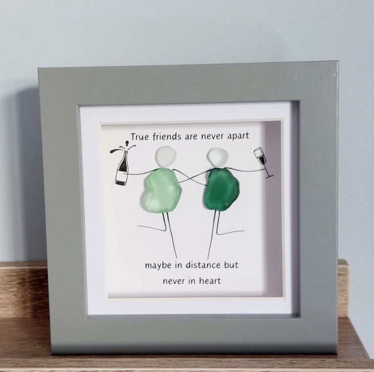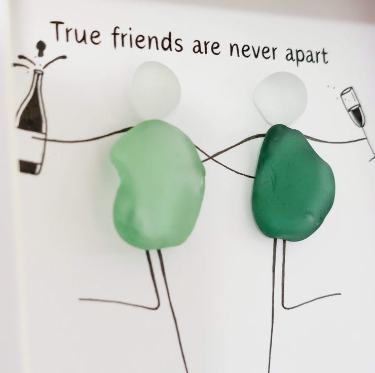 It shows a pair of besties, lovingly crafted from hand-picked sea glass, with their arms linked, celebrating their friendship with champagne. The printed quote above and below the pair reads, "True friends are never apart, maybe in distance but never in heart." The rest of the scene is hand drawn and embellished with beautiful, naturally tumbled sea glass pieces. This piece will be made to order, please read the notes below for more information.