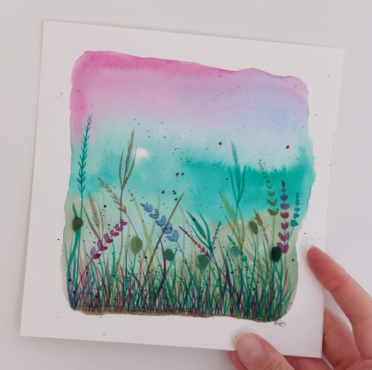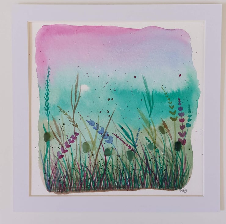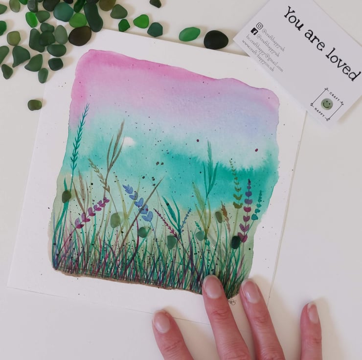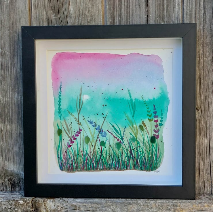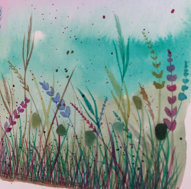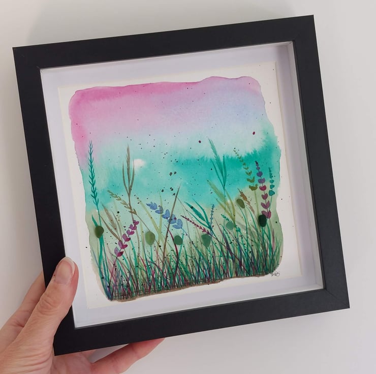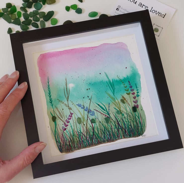 Add a touch of nature to your home with this Abstract Hand-Painted Watercolour Flower Meadow. This original framed artwork is adorned with naturally tumbled sea glass, collected during my beachside adventures. It's an ideal housewarming gift or a charming addition to your home decor. The vibrant background is hand-painted using natural watercolours, making it a truly unique, one-of-a-kind piece.