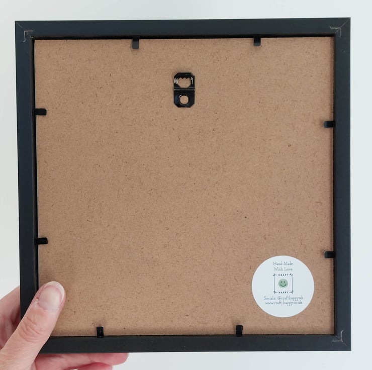 - The frame is 20cm square in black and has a mount. The aperture of the picture is 15cm and there is a hook on the reverse so you can hang it on the wall.