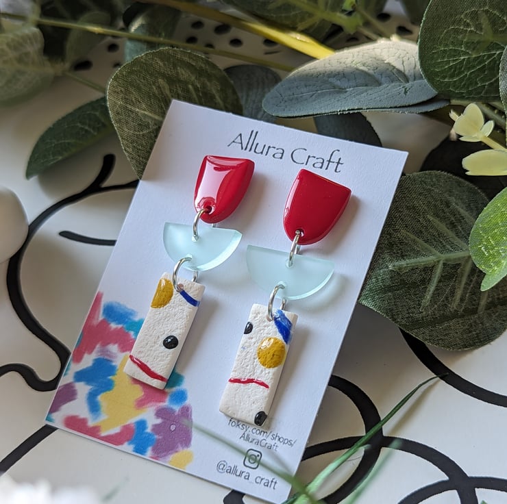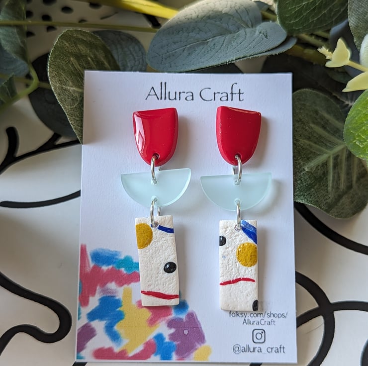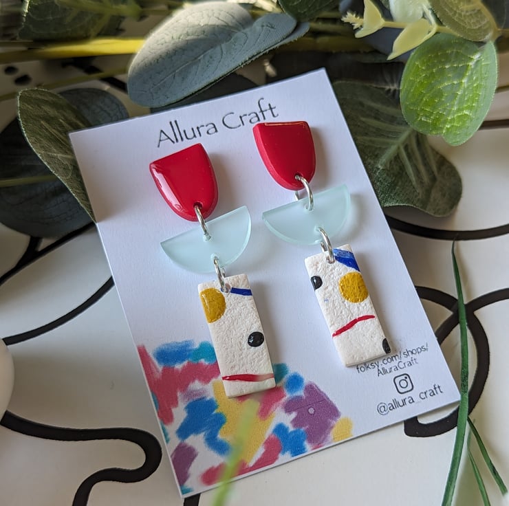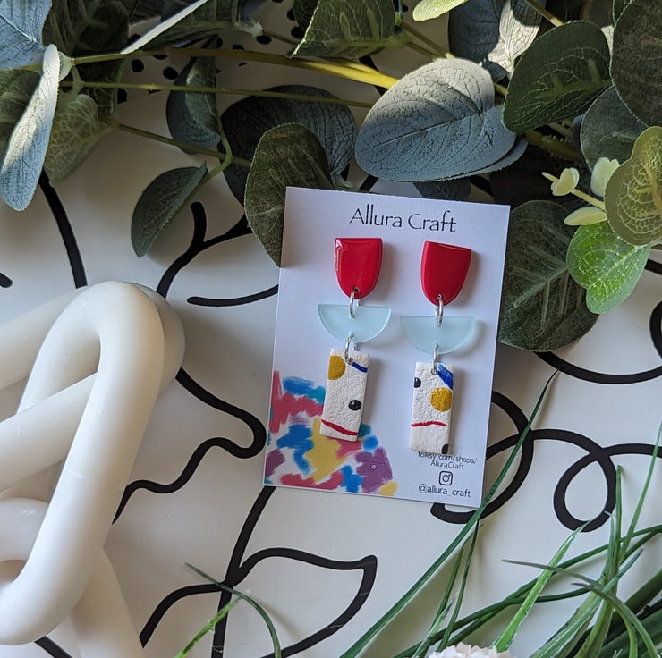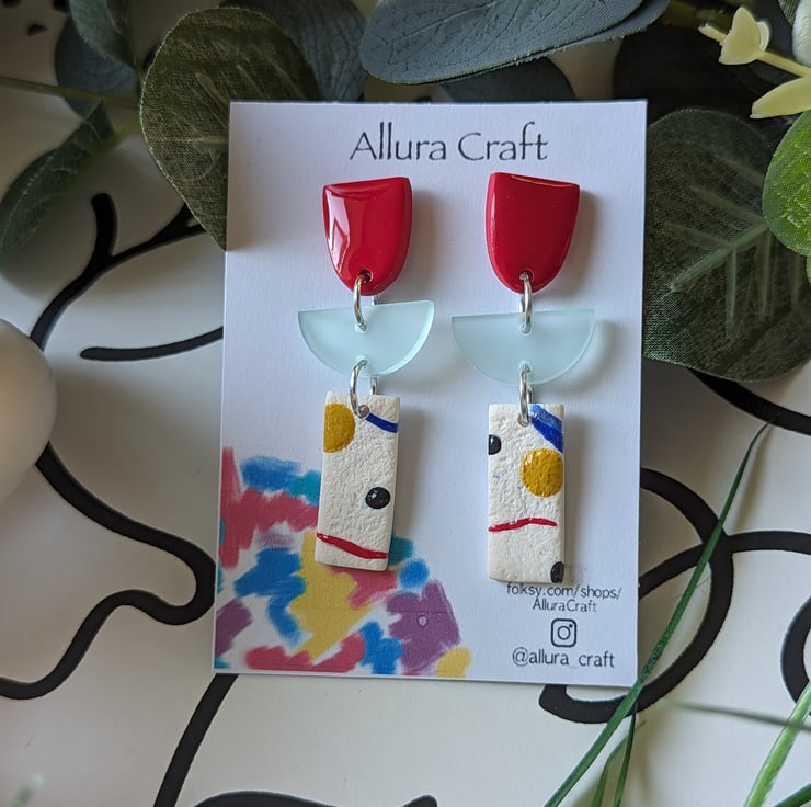 With an arty abstract rectangle that is lightly textured with colour pops, squiggles and splodges of red, royal blue, mustard and black.