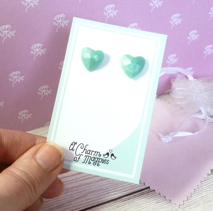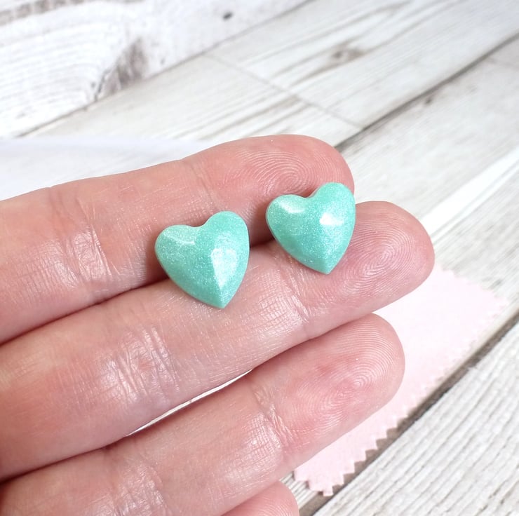 Made from a shimmering pale turquoise resin, these hand-cast heart shaped stud earrings are just 13mm in diameter and have Stainless Steel posts and butterfly backs to limit the risk of allergies.