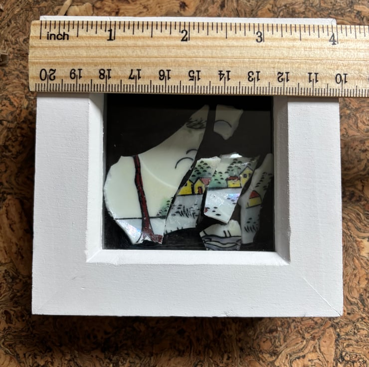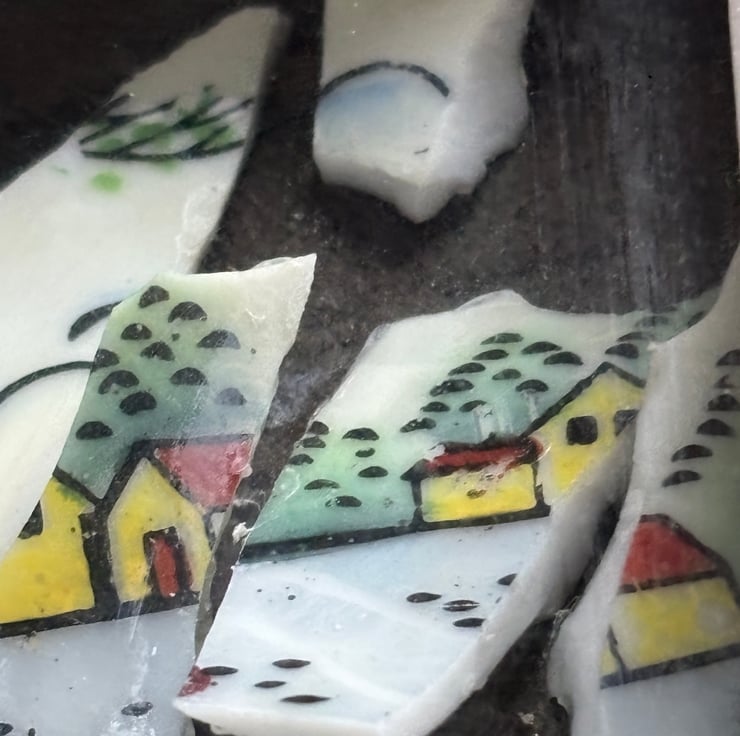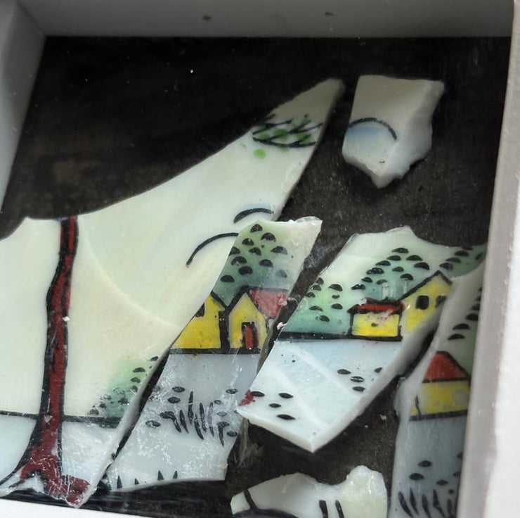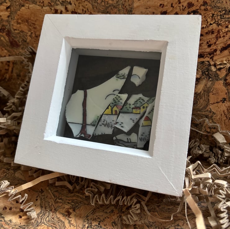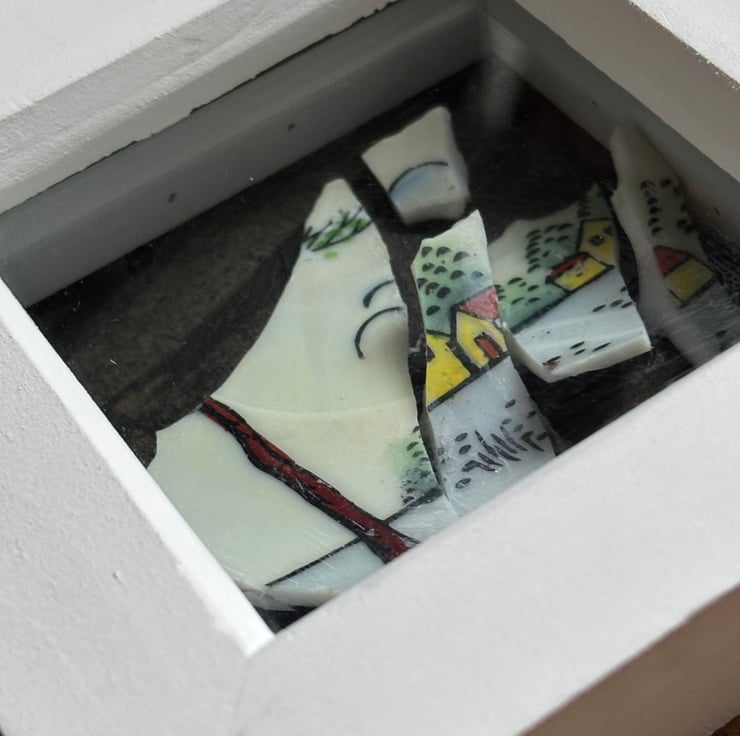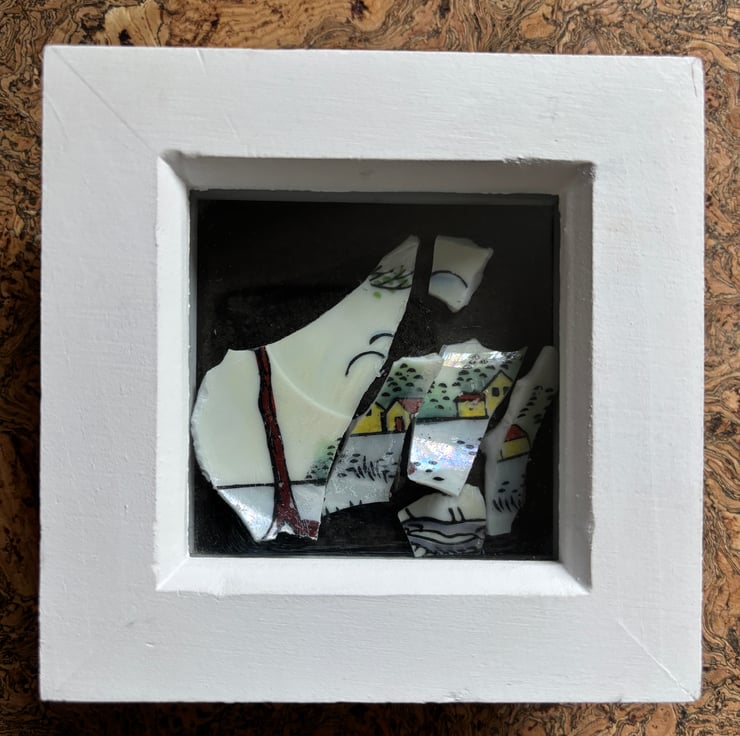 Hand crafted Jewellery and framed artworks using pre loved and discarded ceramics. Ceramic material will show signs of wear and damage. Entire process is a creative experience from discovery to final picture, nothing planned or preconceived. All materials personally collected from river banks, charity shops, roadside, woods, recycle centres, beaches, wherever dropped, dumped or donated ceramics are found, cleaned and shaped into new stories. Each piece comes with a short bio of where the ceramic came from, date found and re-created. Some shards collected are used as found, others are cut randomly which shape the final work. Every piece is individual, nothing replicated, however, due to repetitive patterns in ceramics there will be some similarity but only through the ceramic material not in the final piece.