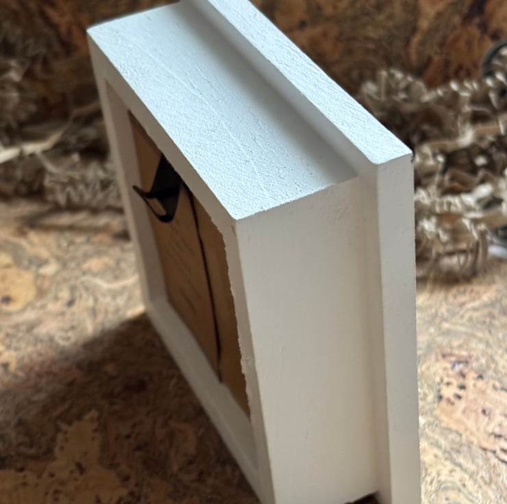 I had a donation of some reclaimed, recycled frames which included a small white painted box frame. This little white frame was perfect for the ‘Island’. A bit rough in places, I usually prefer plain brown but the white feels right for this scene.