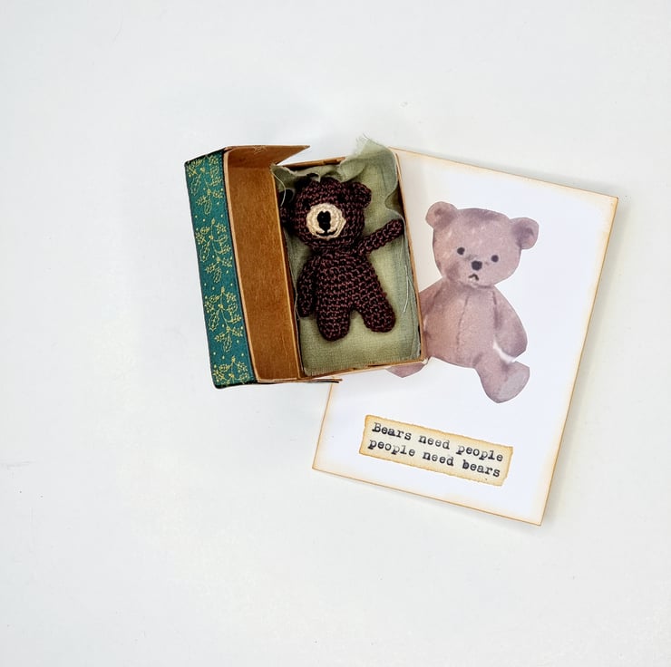 this is a 2 inch teddy crocheted teddy bear , that comes in its own little hand made box .