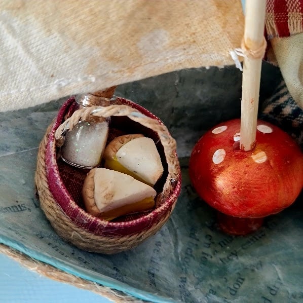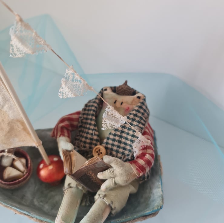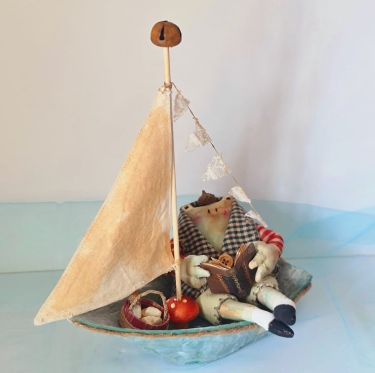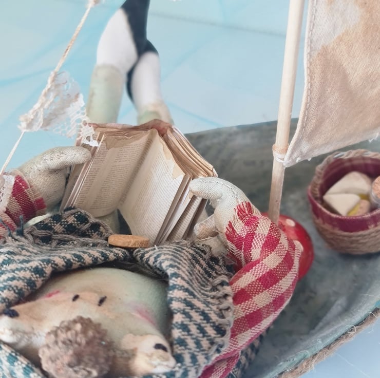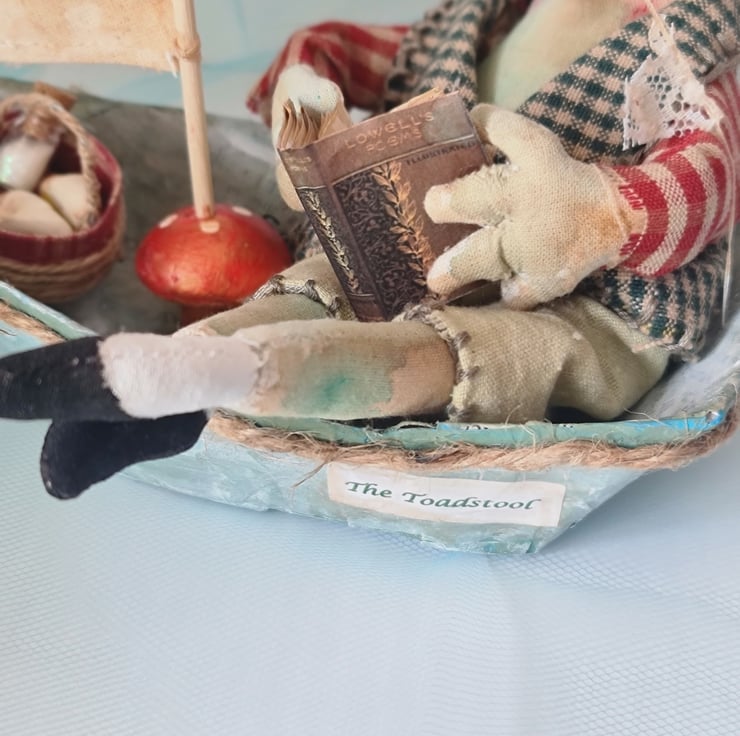 His little sail boat is made from paper mache, with lace flags and a 1930s shirt button on the back. The sail sits in a little toadstool, with a rusty bell at the top. His little poetry book and picnic basket are both handmade.