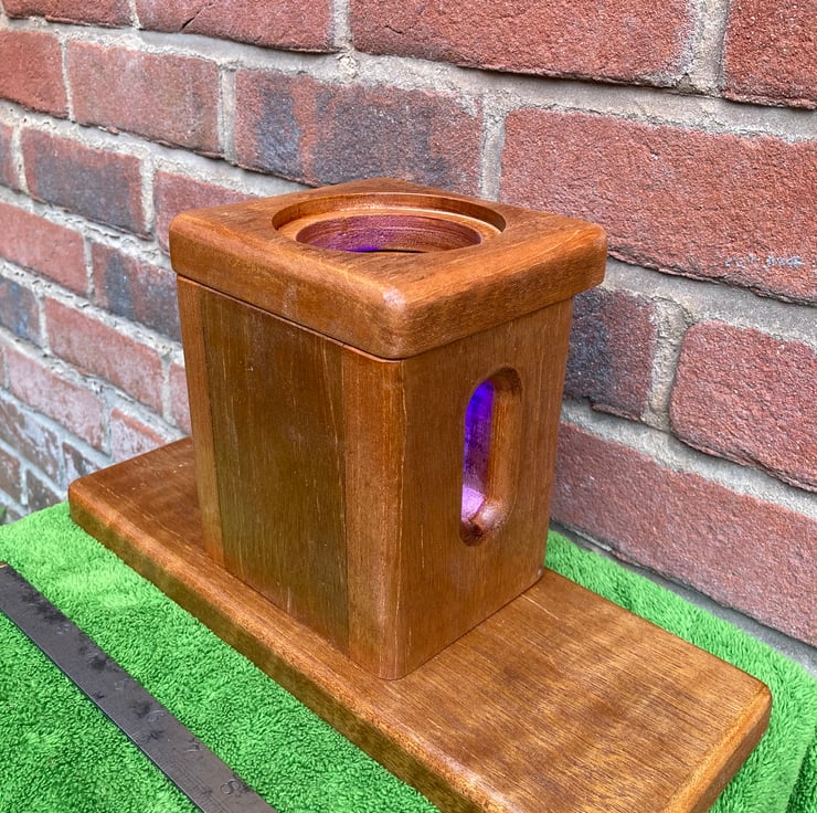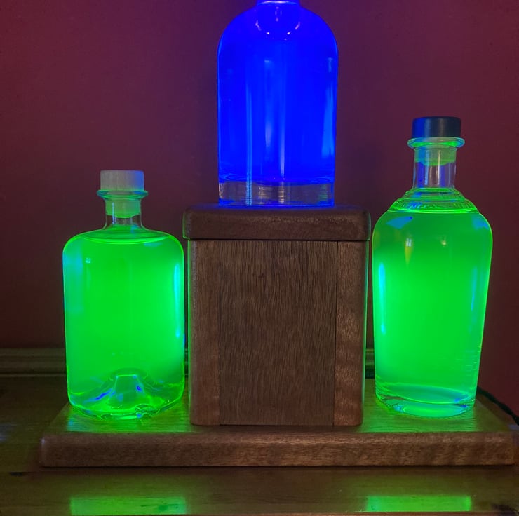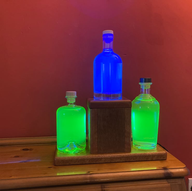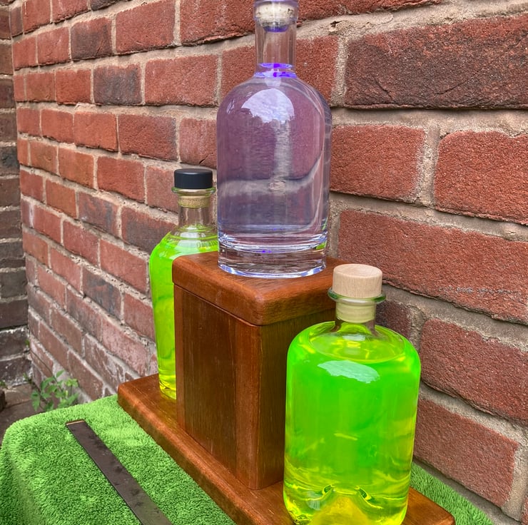 It’s not really radioactive, the reclaimed beech plinth conceals a 4-watt blacklight bulb that radiates UV light through cutouts in the wood into the repurposed spirit bottles which are filled with tap water tinted with a few drops of ultraviolet sensitive fluorescing dye. The effect, however, is magical in a darkened room!