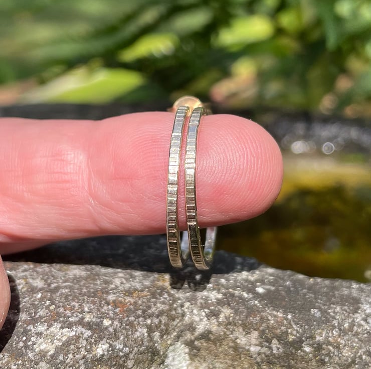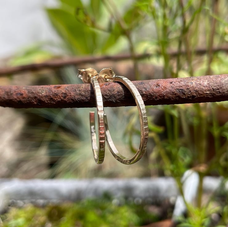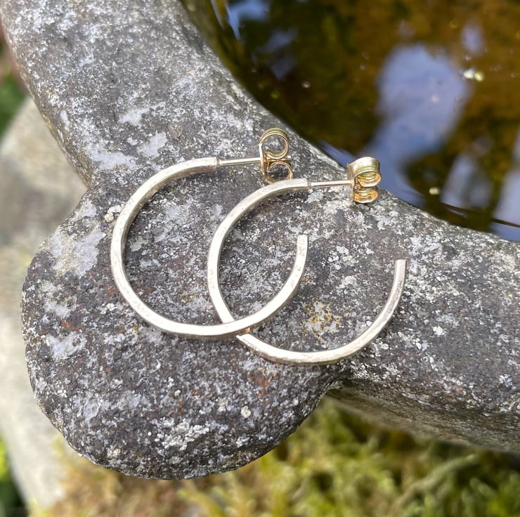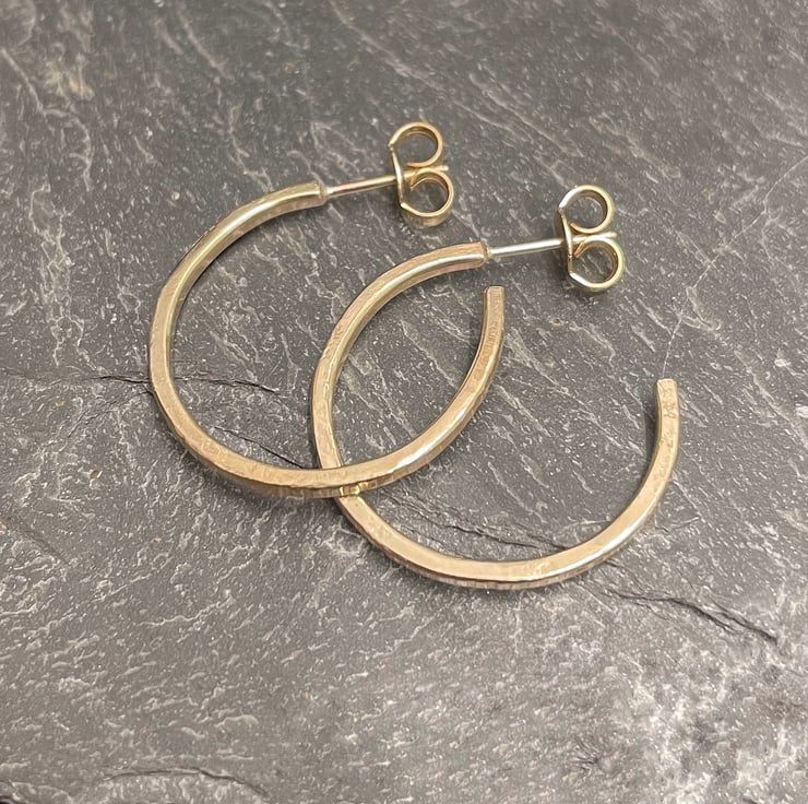 Offcuts of 9ct yellow gold have been melted down and turned into square wire. I have made circular 3/4 hoops and soldered on gold ear posts. They have gold butterfly fittings.