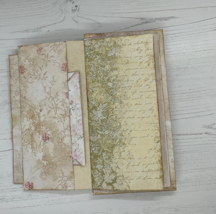 Made from 4 envelopes, each envelope has been covered and made into a flip flop folio. The front cover is a smaller envelope with coffee effect backing paper topped with guipure lace, embellished with labels, shabby chic handmade flowers, a bulb pin with lace and charms to complete the design. 5 signatures each with 26 pages. Paper patterns vary. Pockets, tags, Journalling cards, envelopes and ephemera.