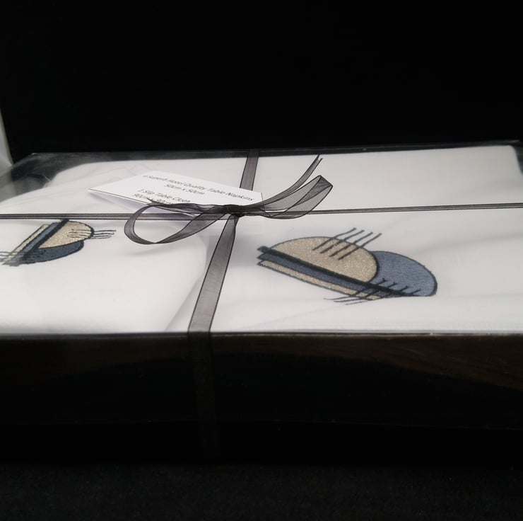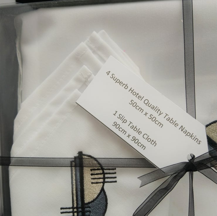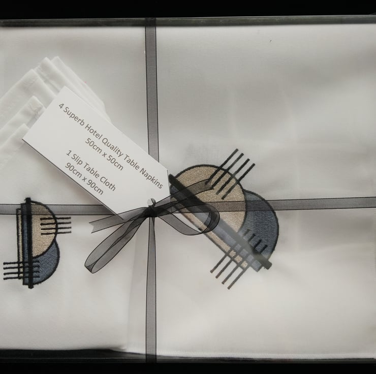 A Set of 4 Art Deco Design Embroidered Napkins and 1 Tablecloth/Slip Cloth .These 4 Napkins and tablecloth are my own designs. The Napkins and Table cloth come in a presentation gift box as in image, The tablecloth is known as a Slip Cloth, ( a cloth that sits at an angle across the main Tablecloth). The slip cloth is 90 cms x 90cms and has a design on all 4 corners. The napkins have a design in one corner and measure 50 cms x 50 cms
