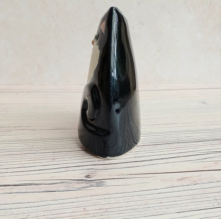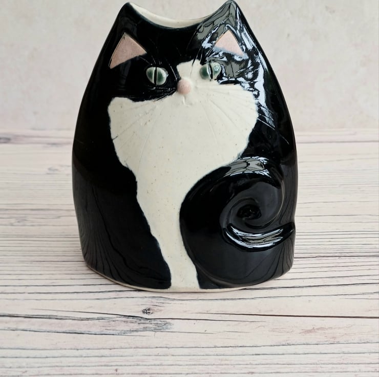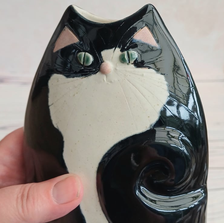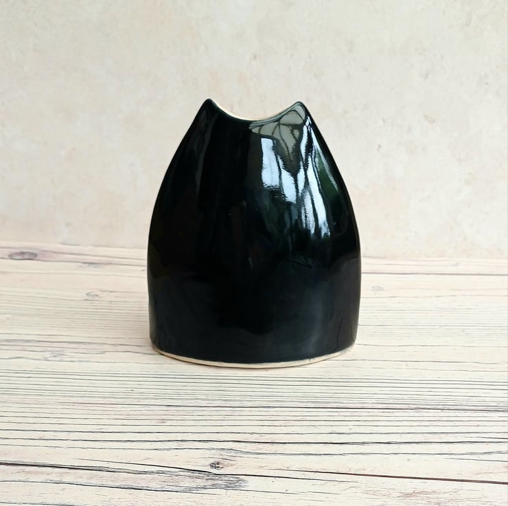 A handmade slab built cat vase ,made from stoneware clay .glazed in a lovely glossy black with an a matt ivory tummy and interior . It has a narrow opening that can accommodate a few stems .