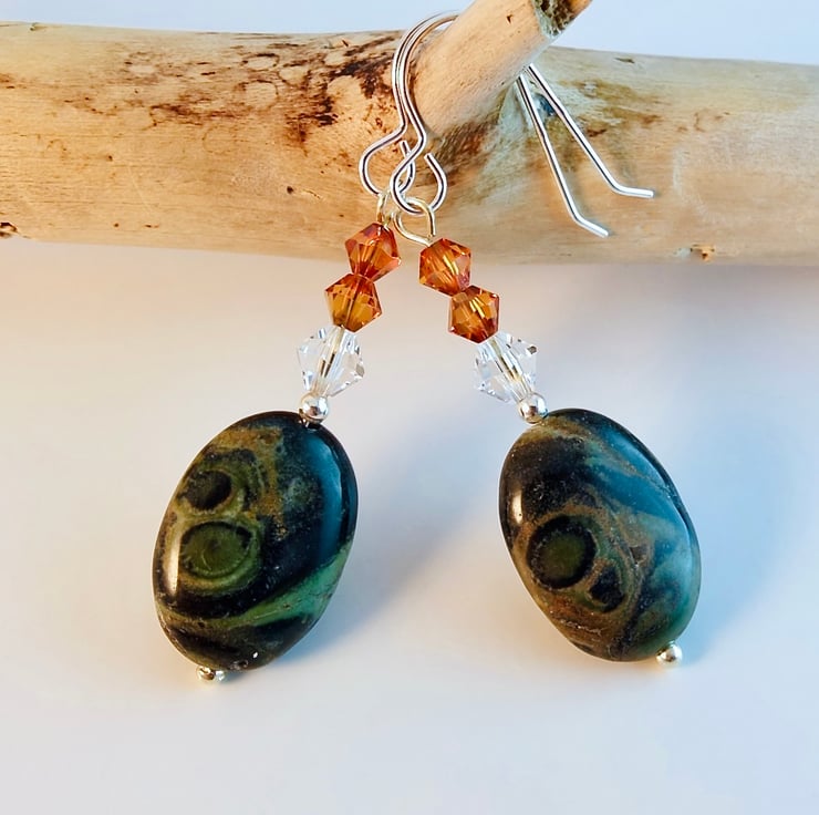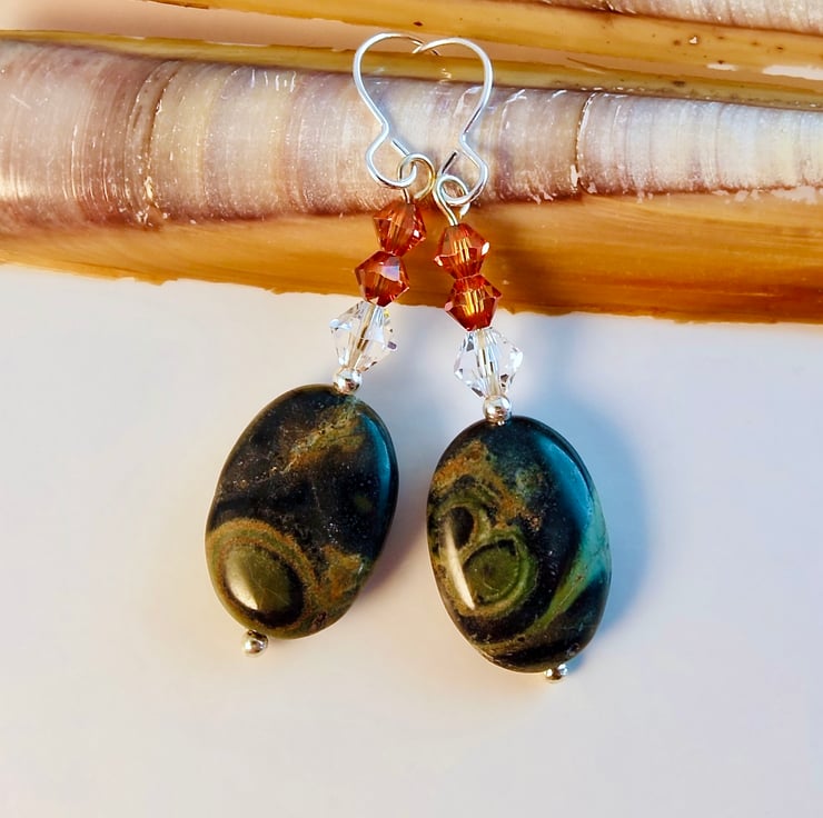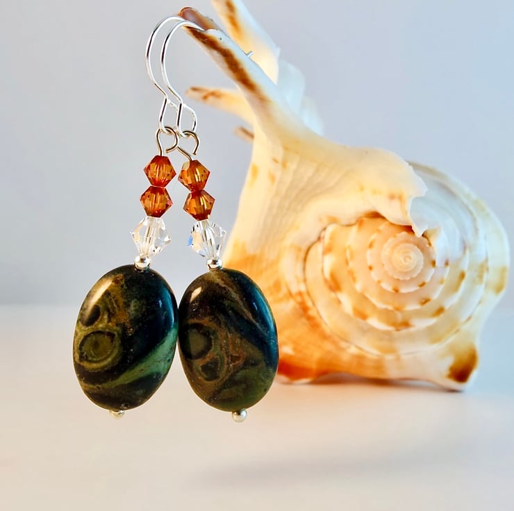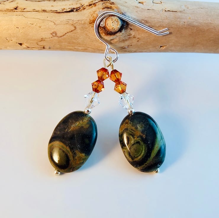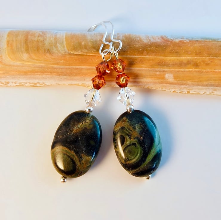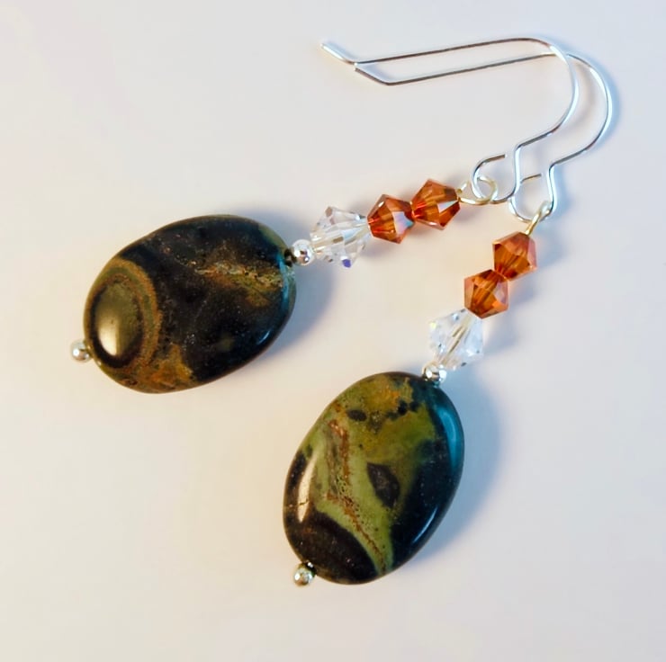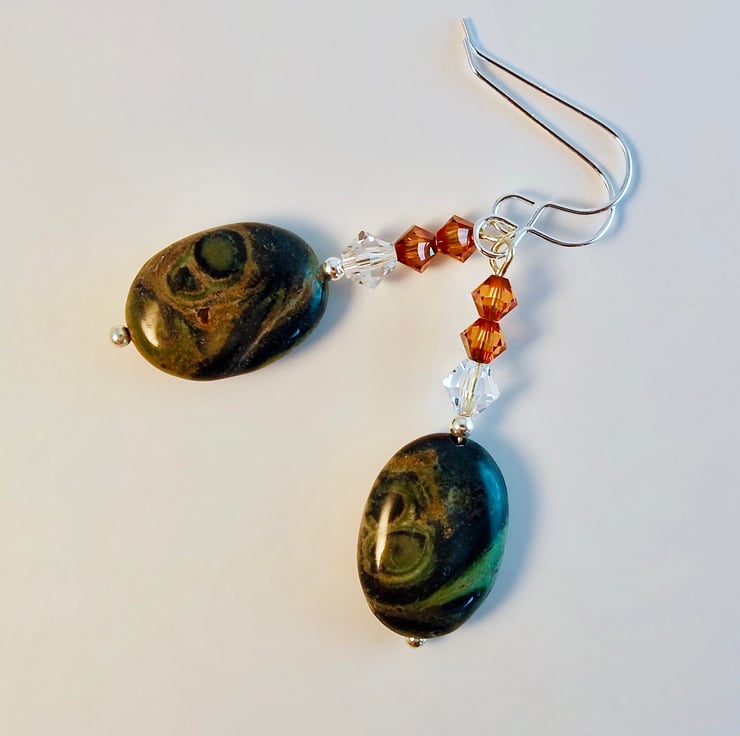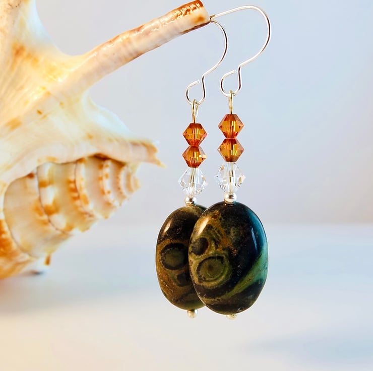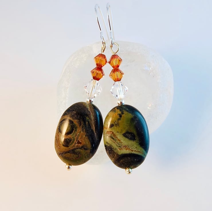 Gorgeous, polished, 13x18mm oval Kambaba Jasper bead topped with a 5mm Clear Swarovski Crystal and two 4mm Swarovski 'crystal copper' bicones, separated from the Jasper by a 2mm sterling silver round bead and hung from sterling silver ear-wires stamped '925'.