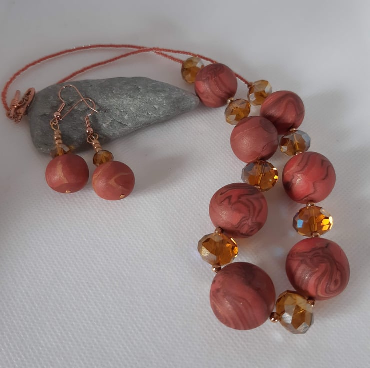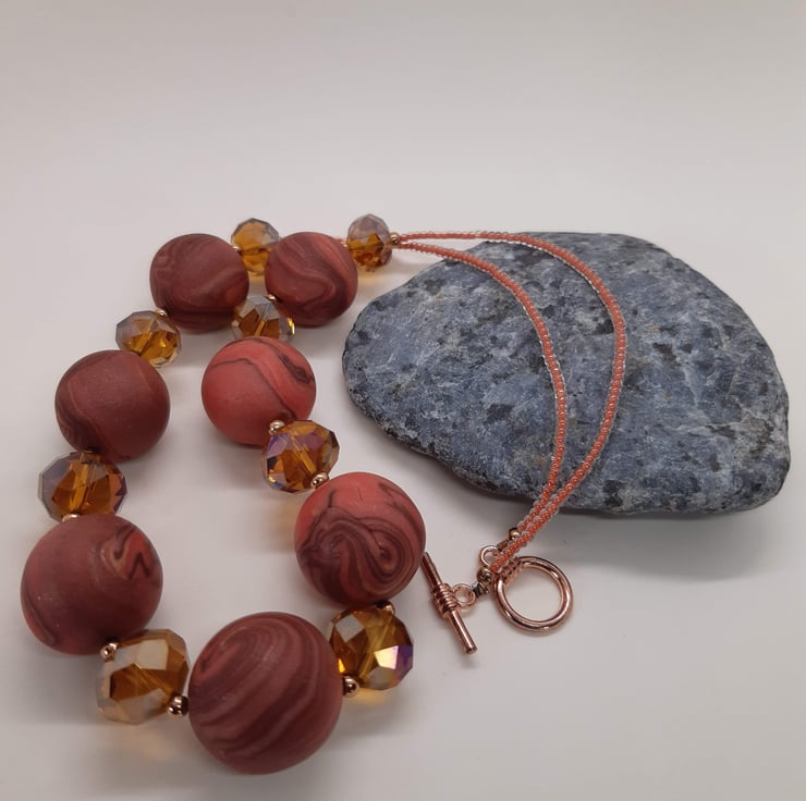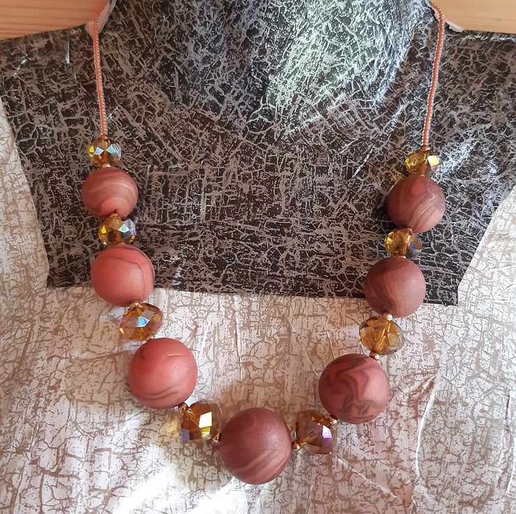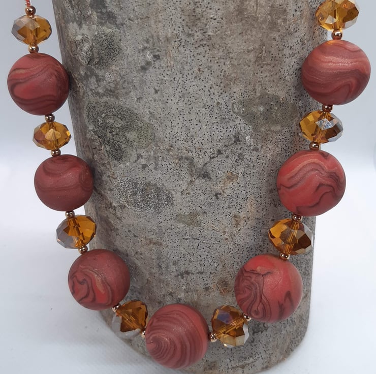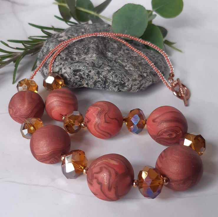An attractive necklace featuring handmade polymer clay beads in a dark salmon pink, gold and bronze unique swirl design.