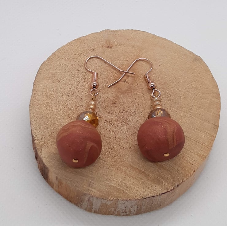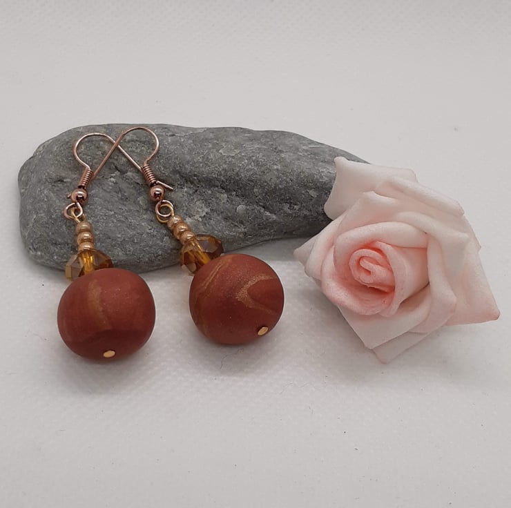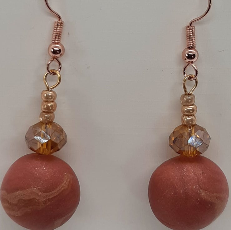 Polymer clay dangly earrings in dark salmon pink, amber and gold.