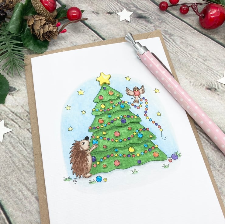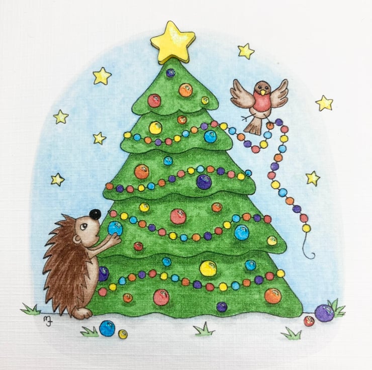 This cute Hedgehog Christmas card has been designed using my own original watercolour illustration. The card has been printed out onto good quality linen embossed card. The card has been decoupaged up in parts and finished off with a little glitter detail.