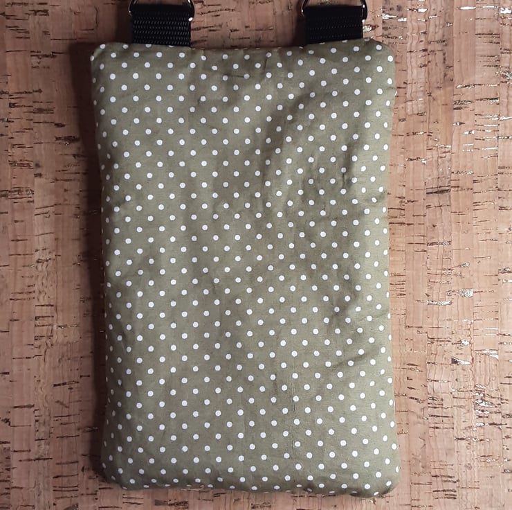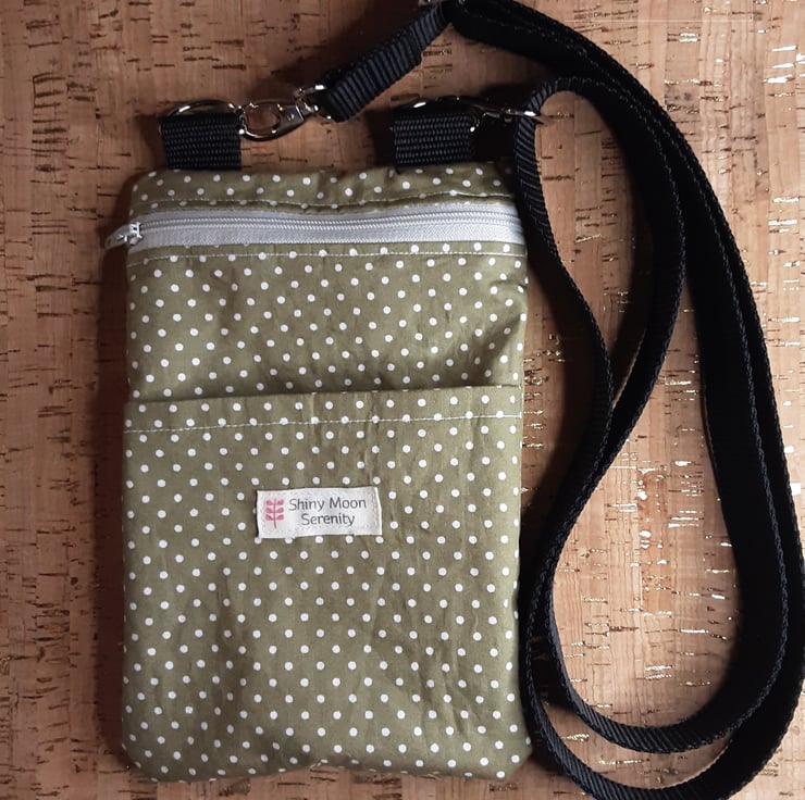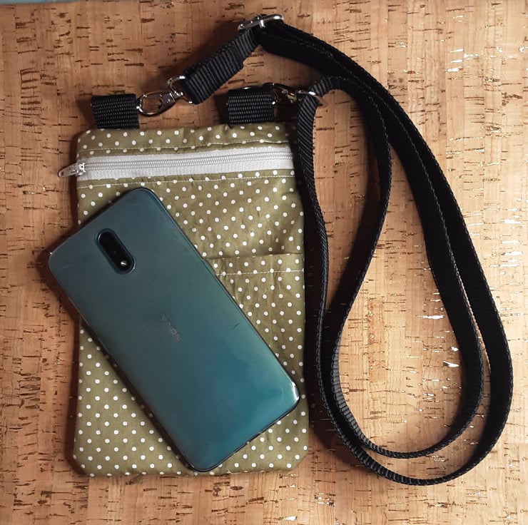 It has one adjustable and detachable handle made from black polypropylene webbing. (With the addition of two carabiner clips, (not supplied) the phone bag can be attached to a travel bag.)