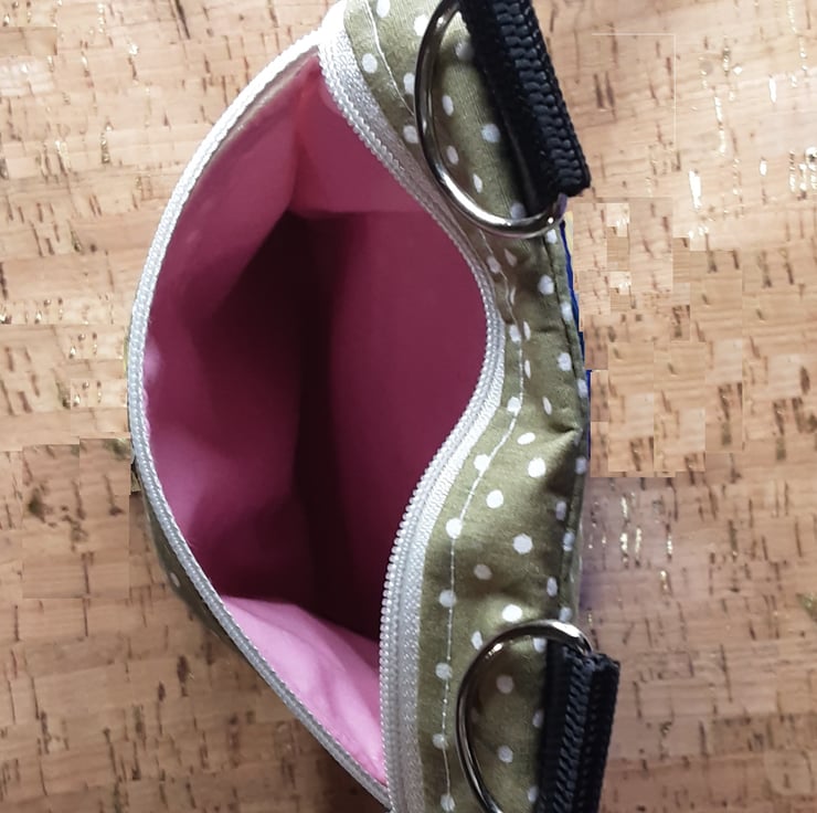 The front, back and pocket panels are made from khaki with small white dot print cotton fabric. The lining is made from pale pink poly-cotton fabric.