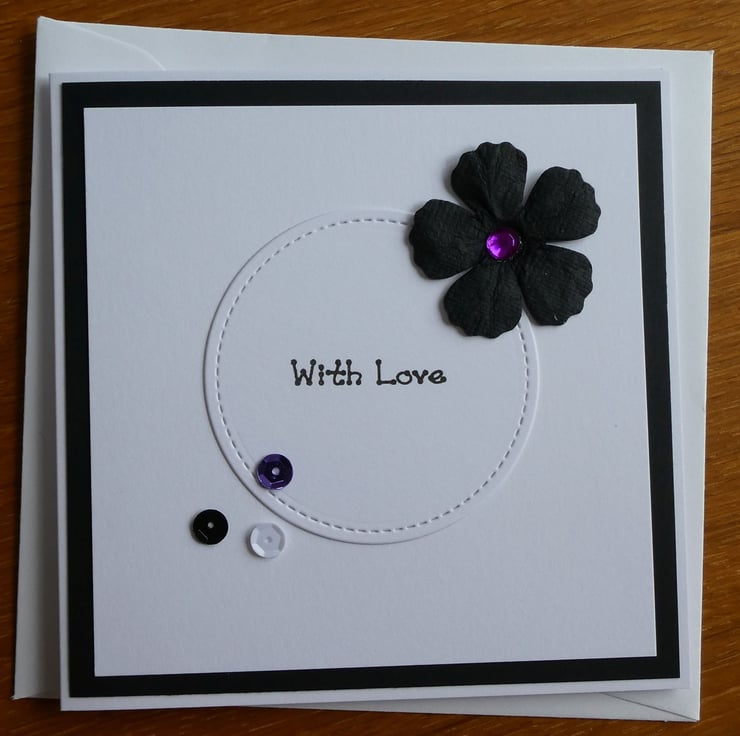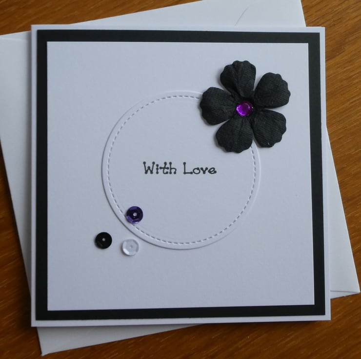 This simple card in shades of purple, black and white features a handmade paper flower and sequins and with the greeting With Love would be suitable to send for many occasions such as a Birthday, Thinking of You, Get Well or Thank you.