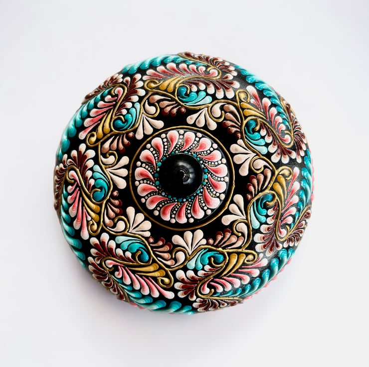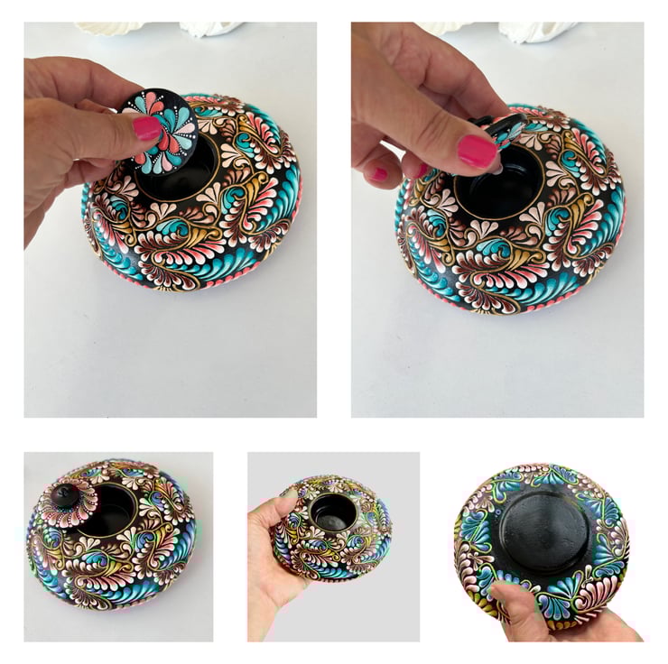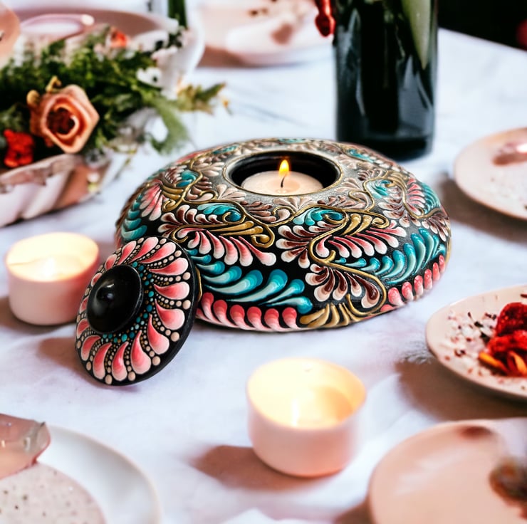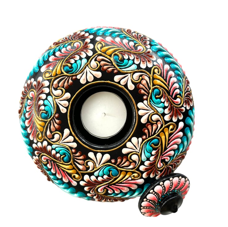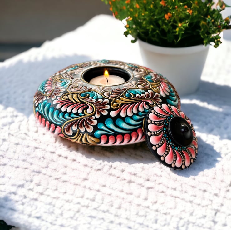 A large 17cm diameter circular tea-light holder with matching lid. Hand painted in layered acrylics for a stunning 3D effect. It has been finished with 2 coats of satin varnish to protect from UV and dust.