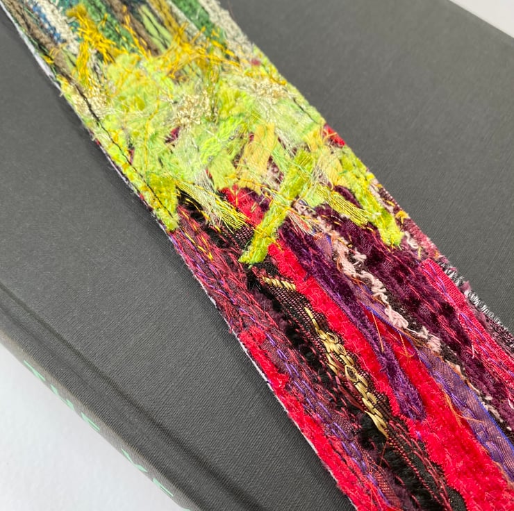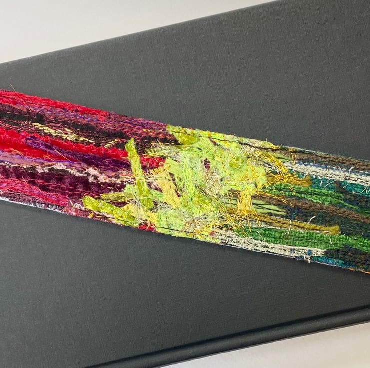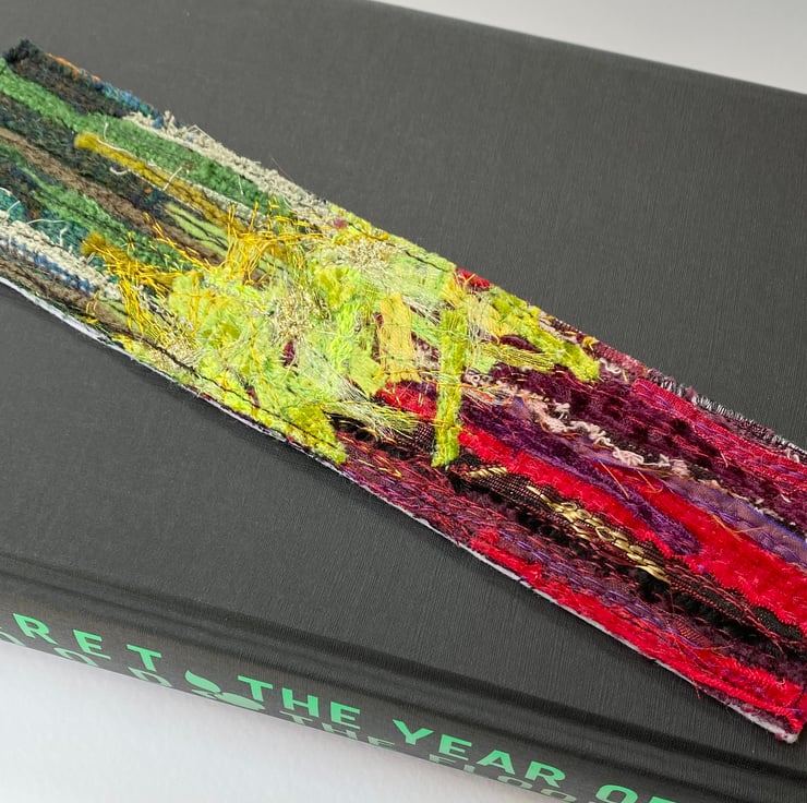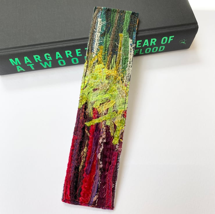 This up-cycled abstract bookmark has been enhance with free motion embroidery. It measures 5 x 22cm and is felt backed.