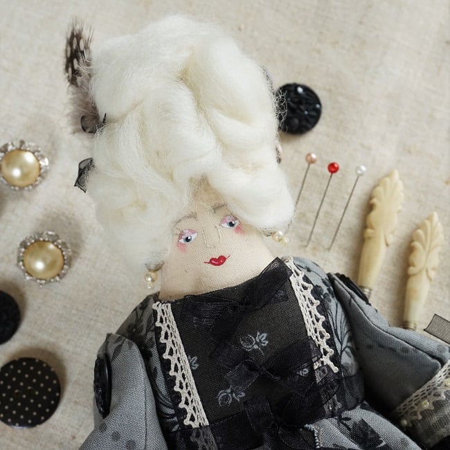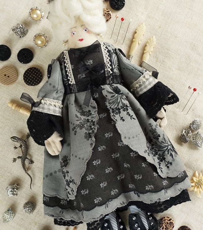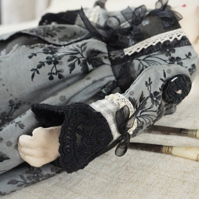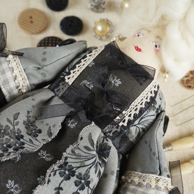 She is dressed in a coordinating collection of Moda fabrics in warm greys and blacks with a . Rococo feel in keeping with her panniers and kirtle. Her outfit is completed with tiny buttons, leather beaded shoes and lots of tiny organza bows. She has co-ordinating knickers and underskirts in cotton and lace.