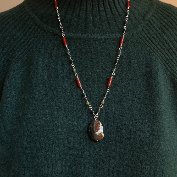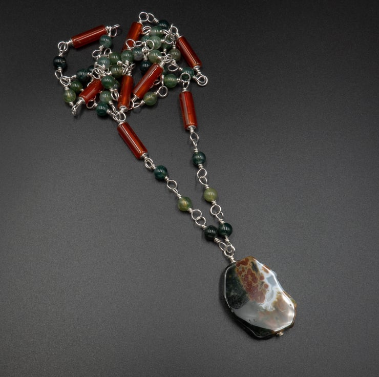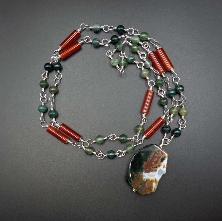 Gorgeous earthy tone soft green moss agate 4mm smooth rounds and red agate 4 x 12mm tubes are hand linked with sterling silver wire to form the necklace chain. A focal pendant of a polished slab of ocean agate complete the design.