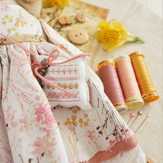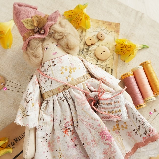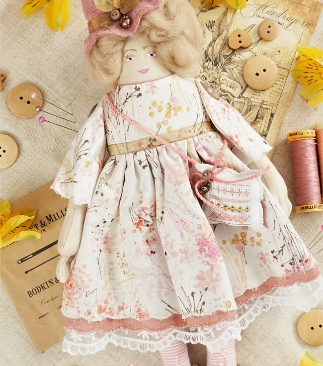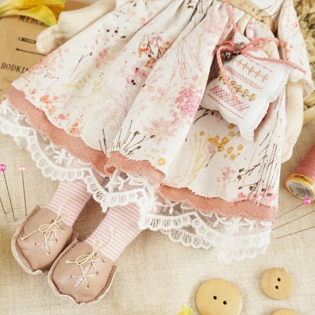 She is dressed in a pretty quality cotton with painterly wild flowers in golds, pink peach and browns. Her outfit is completed with tiny buttons, leather shoes and a little sampler on her little sachet. She has co-ordinating knickers and underskirts in cotton and lace.