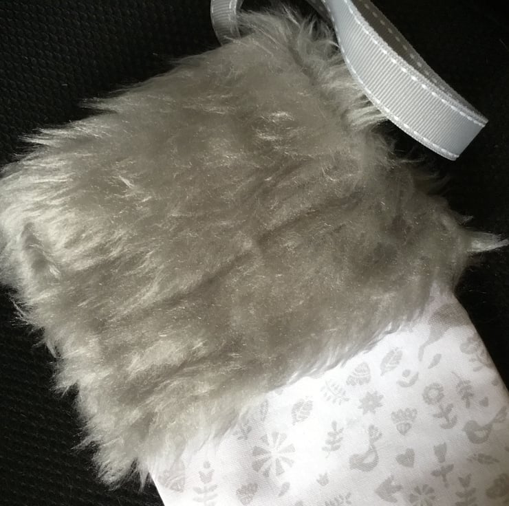 It is in a pale grey and white colour scheme with a grey fur trim and grey hanging ribbon.