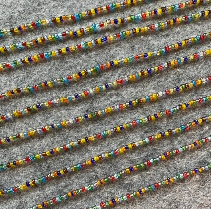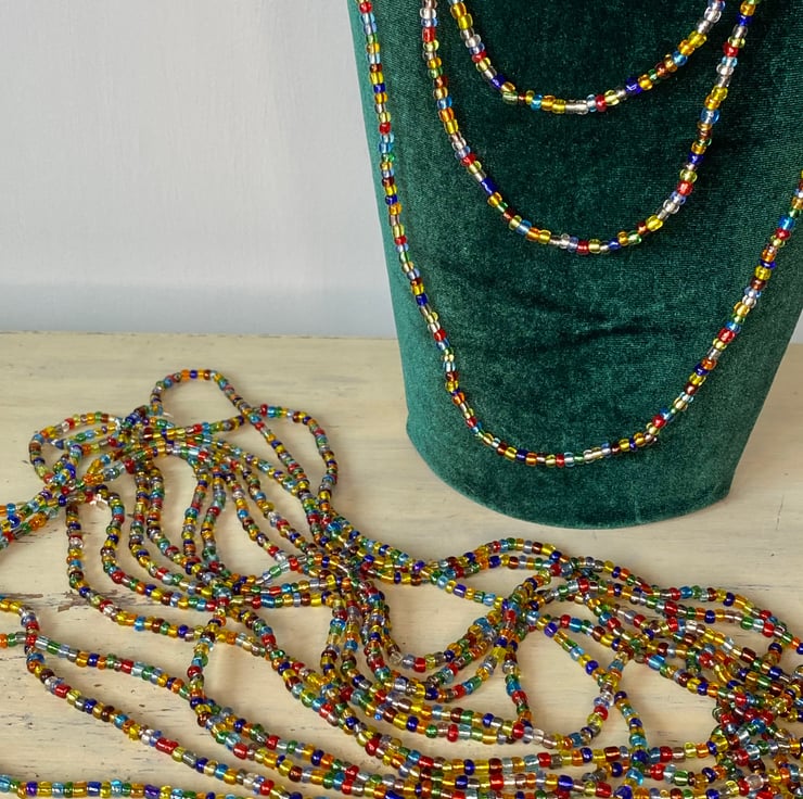 Hippy beads hand strung using reclaimed glass beads. There are three lengths so please specify very long, long or medium in the box, they look awesome layered! Strung on waxed cotton and crimped at the ends, no fastenings, these simply pop over your head.