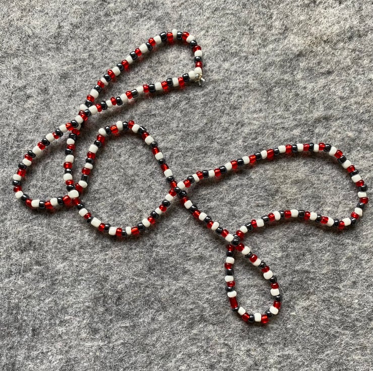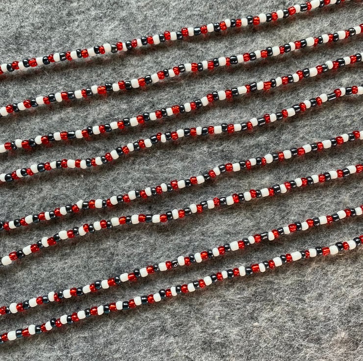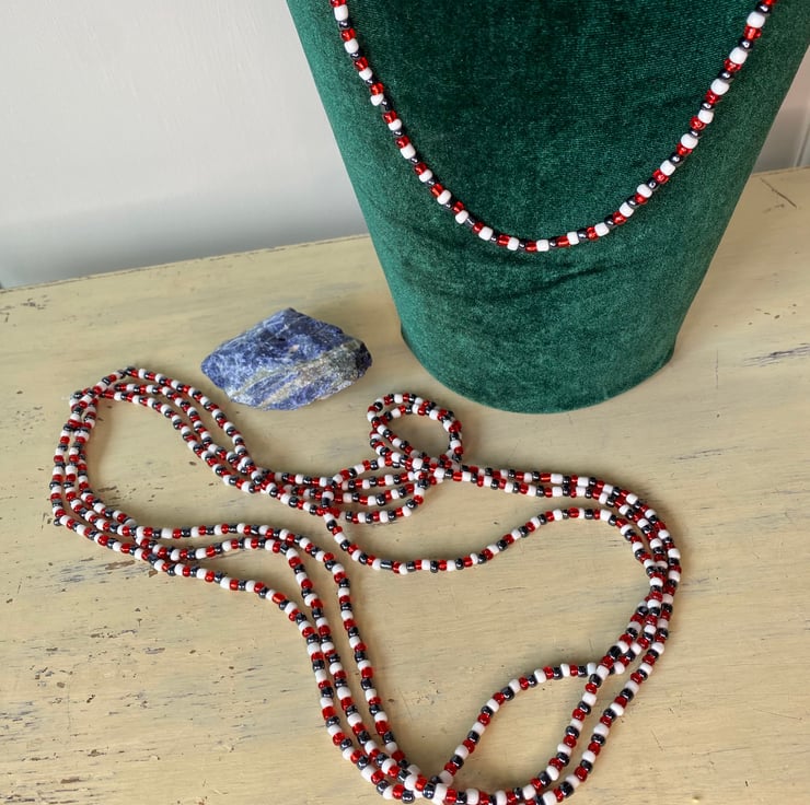 Red white and blue glass beads. Made using reclaimed beads, on waxed cotton with crimped ends. No fastenings, they simply pop over your head.