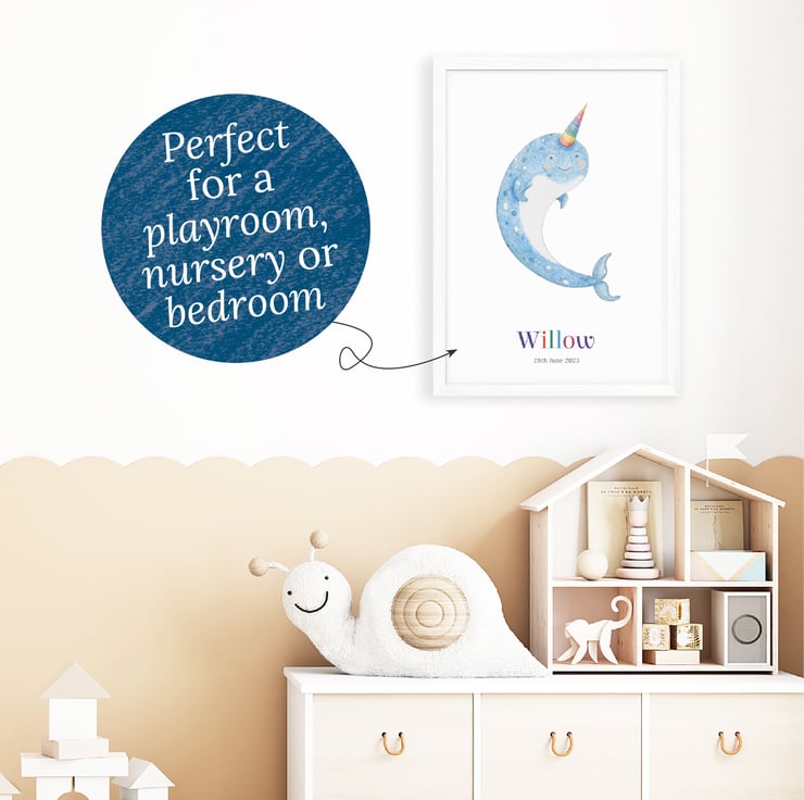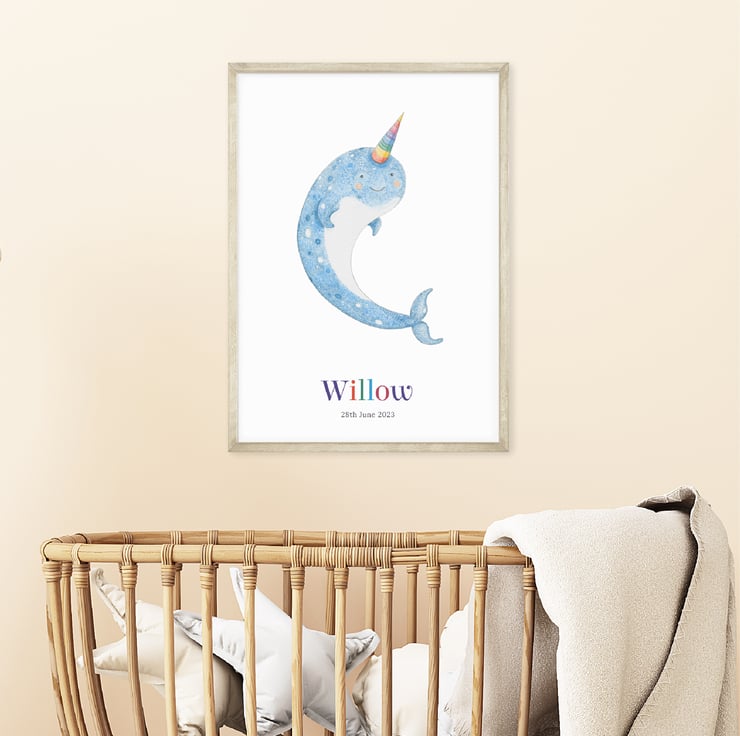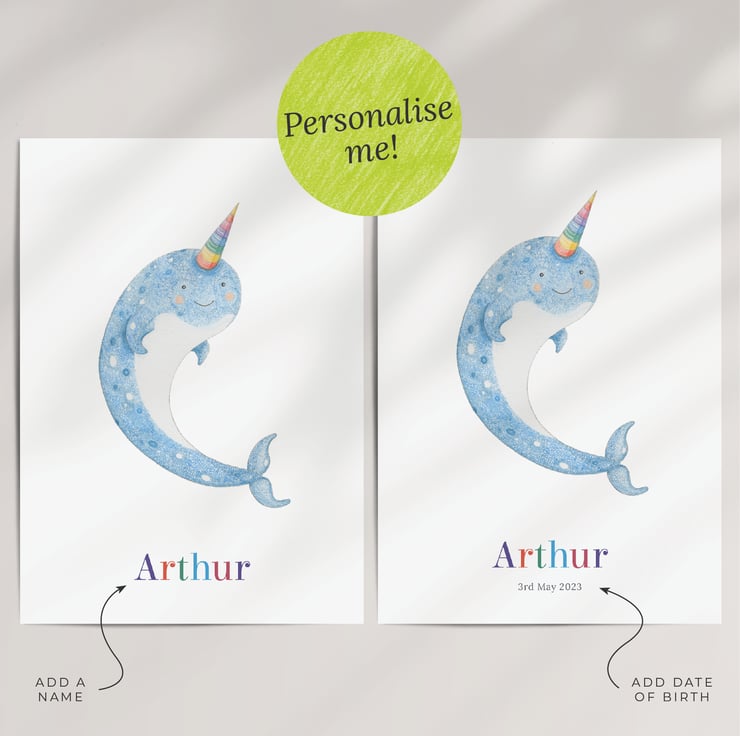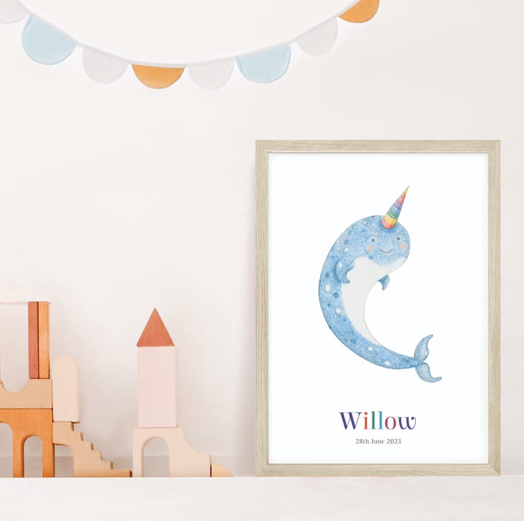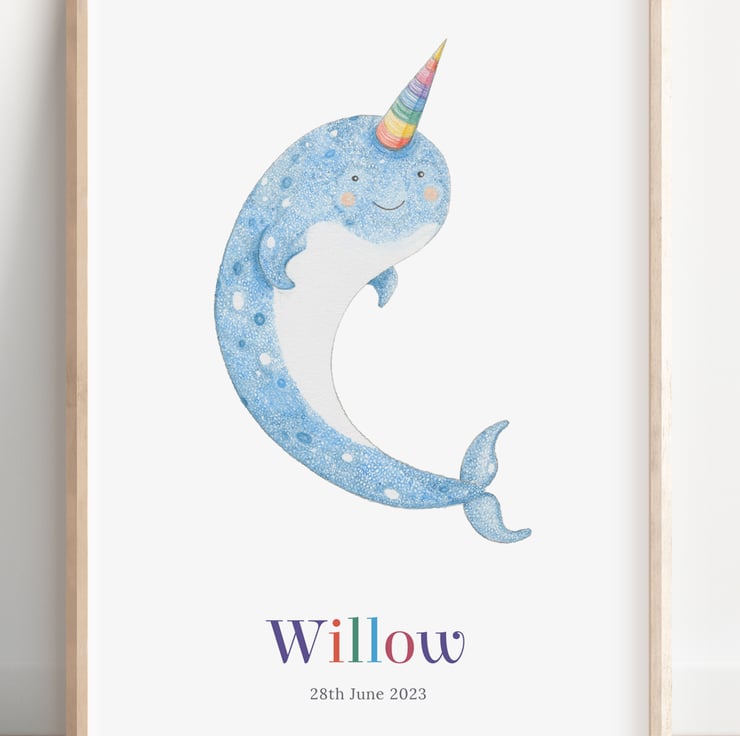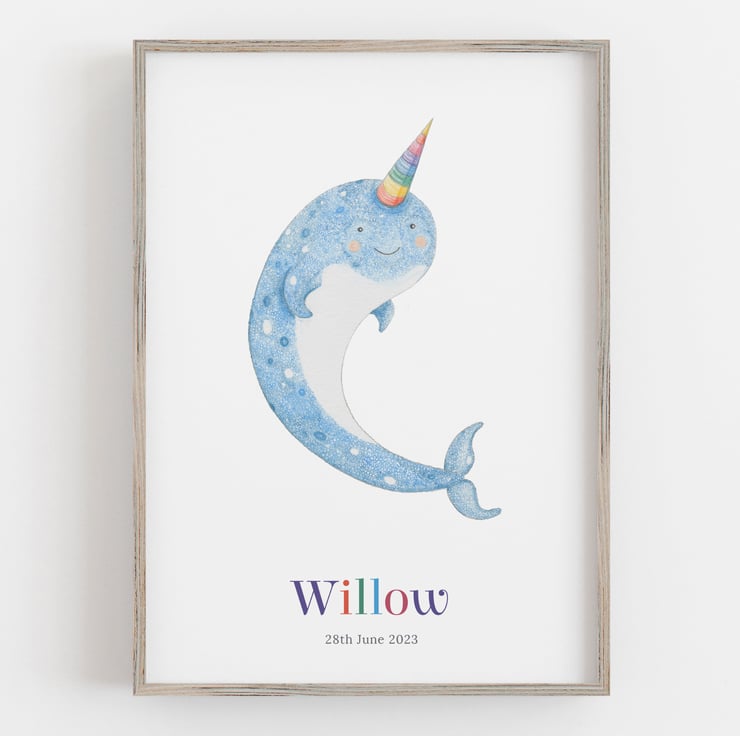 Dive into a world of whimsy and wonder with this personalised narwhal print! You can add a name and date of birth to make this print a truly unique gift for a little one. It would make a wonderful first birthday present for a baby.
