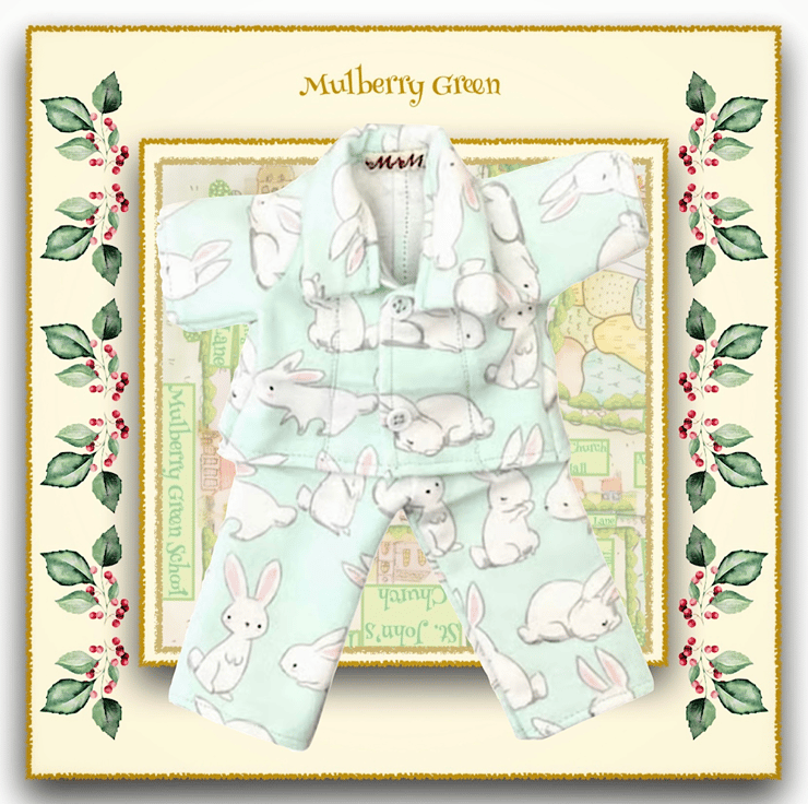 A sweet little pair of soft wincyette pyjamas in a cute bunny print to fit the Mulberry Green characters. The pyjamas are made from brushed cotton wincyette and are tailored like real pyjamas. They fasten with poppers under two little buttons.