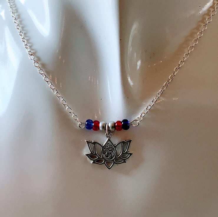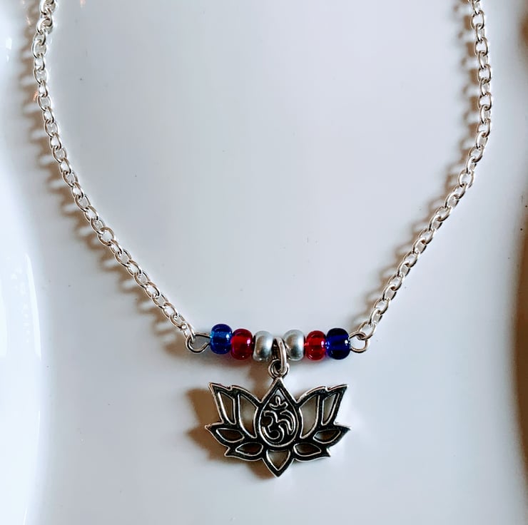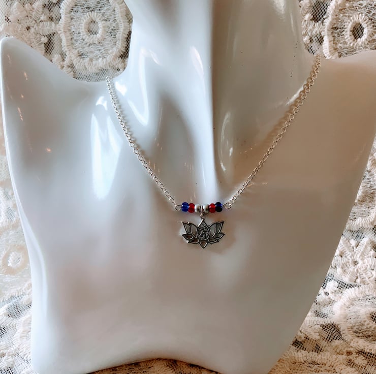 The Lotus flower is centred between silver, ruby red and royal blue glass beads and hangs on a silver plate chain with extention to ajust to chosen length. At the end of the extention chain is a mini spiral of life charm.