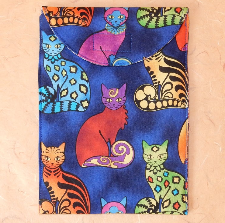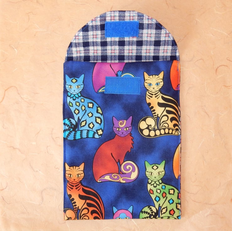 This kindle case is designed to fit kindle and kindle paperwhite, but please check the size of your gadget as there are so many variations. This is made from good quality cotton fabric featuring colourful cats, with a layer of wadding for protection and a check lining. The case fastens with Velcro.
