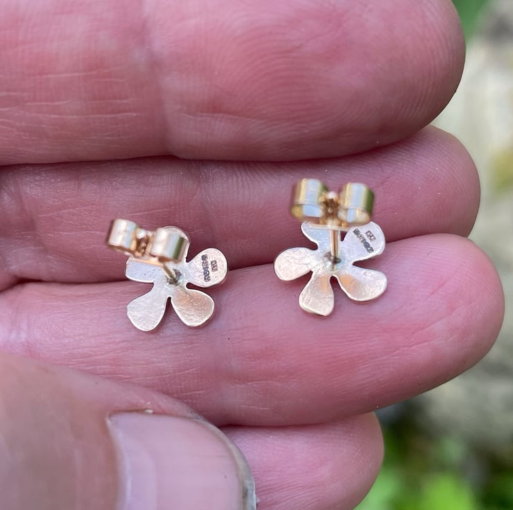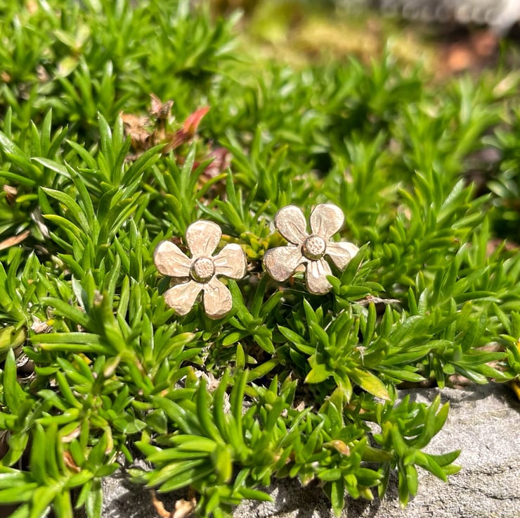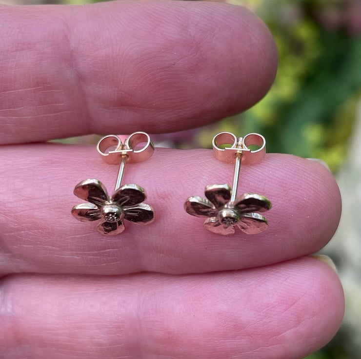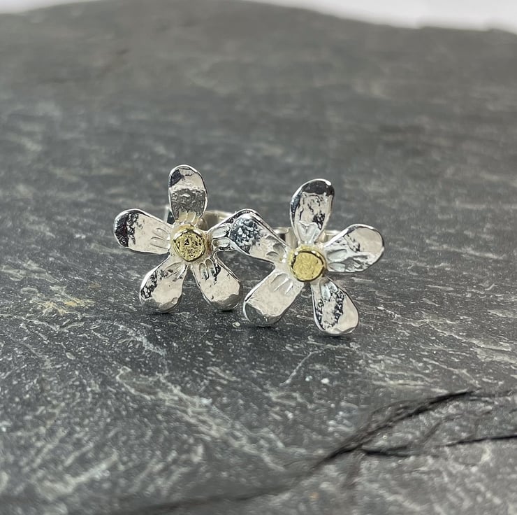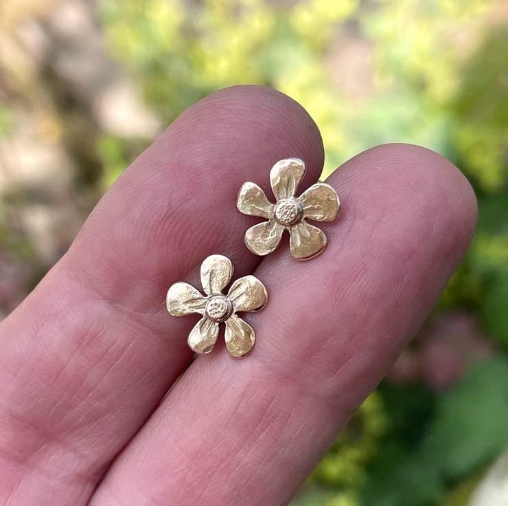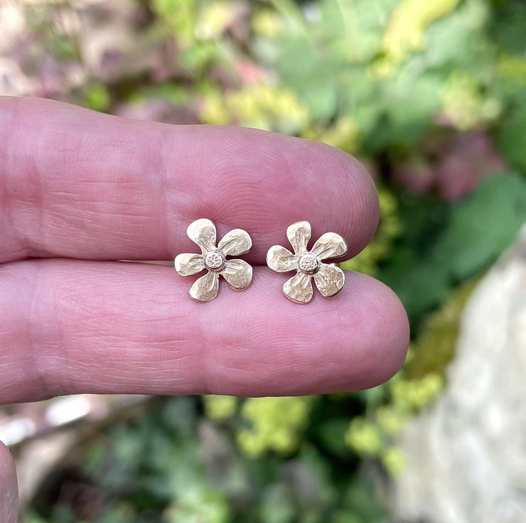 Small gold flower shapes have been cut and hammered for texture and detail. I have added a small textured gold centre to the flowers and given the metal a shiny finish.