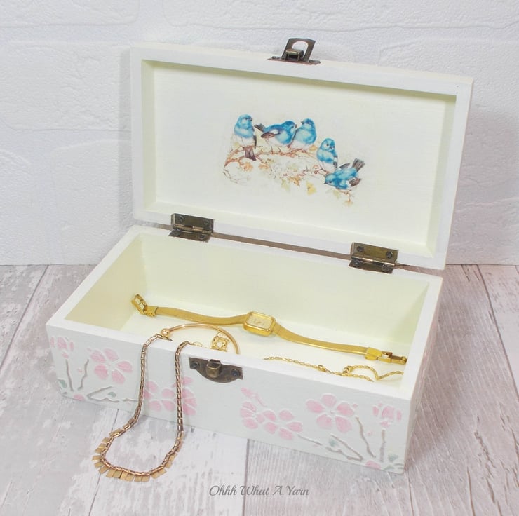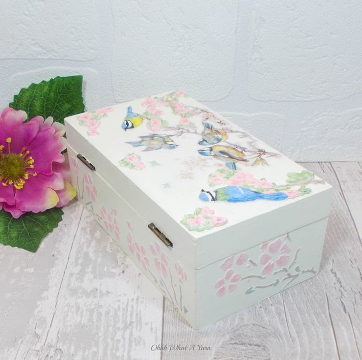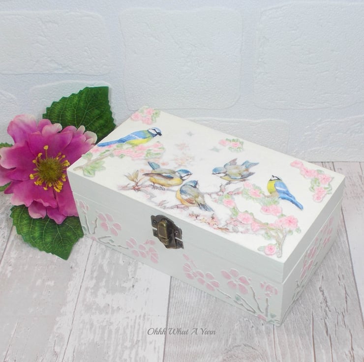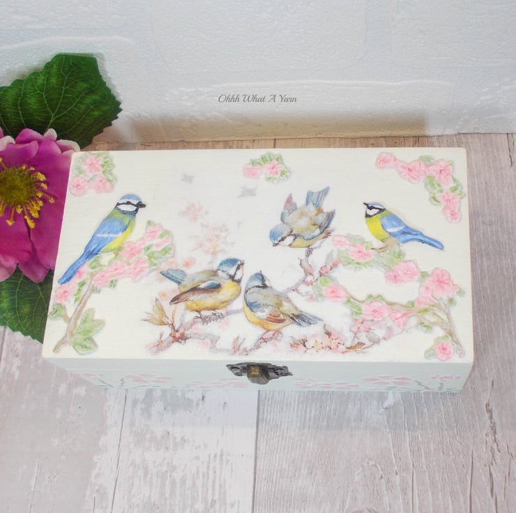 This pretty cream trinket box has been decorated with decoupage blue tits and airdry clay 3D blue tits that I have hand painted with acrylic paints. The 3D birds are sat on 3D airdry clay hand painted cherry blossoms.