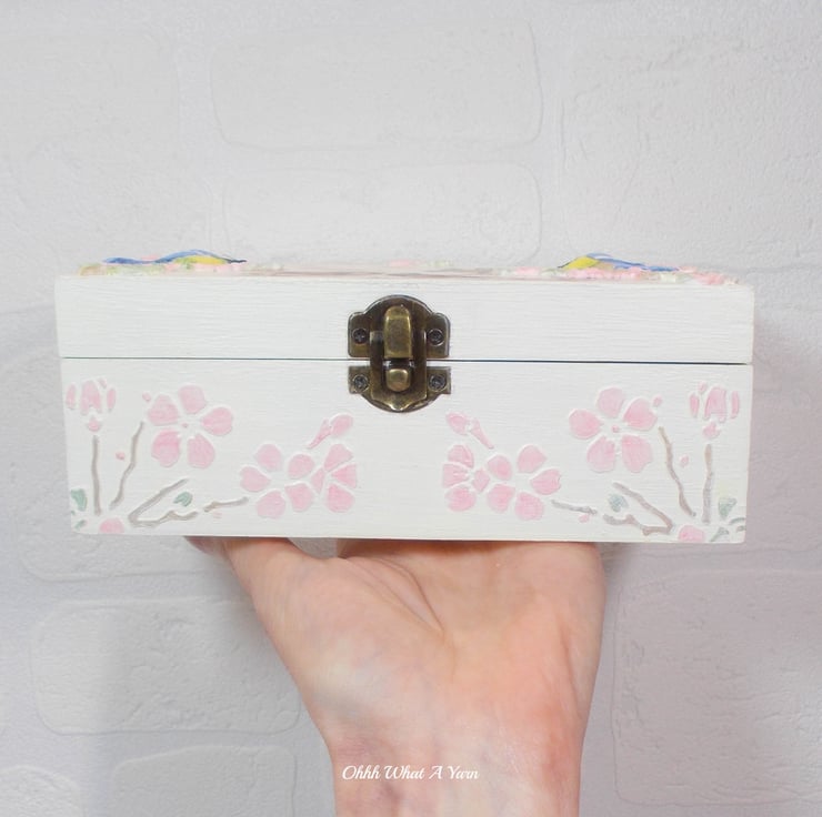 Around the outside of the box I have used stencils to add raised cherry blossoms that I have then hand painted.