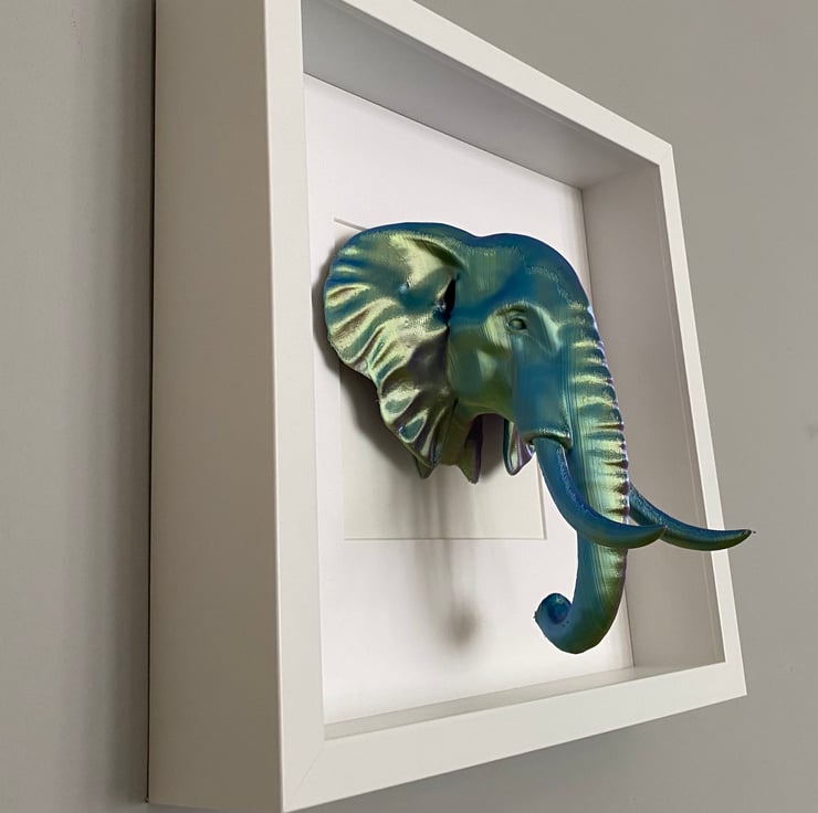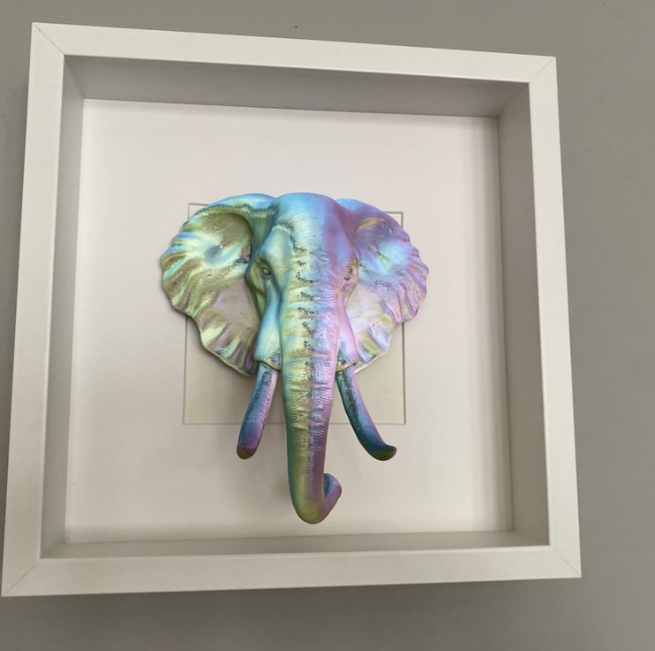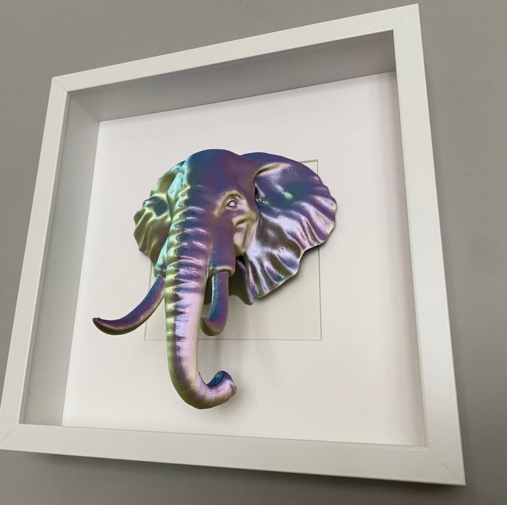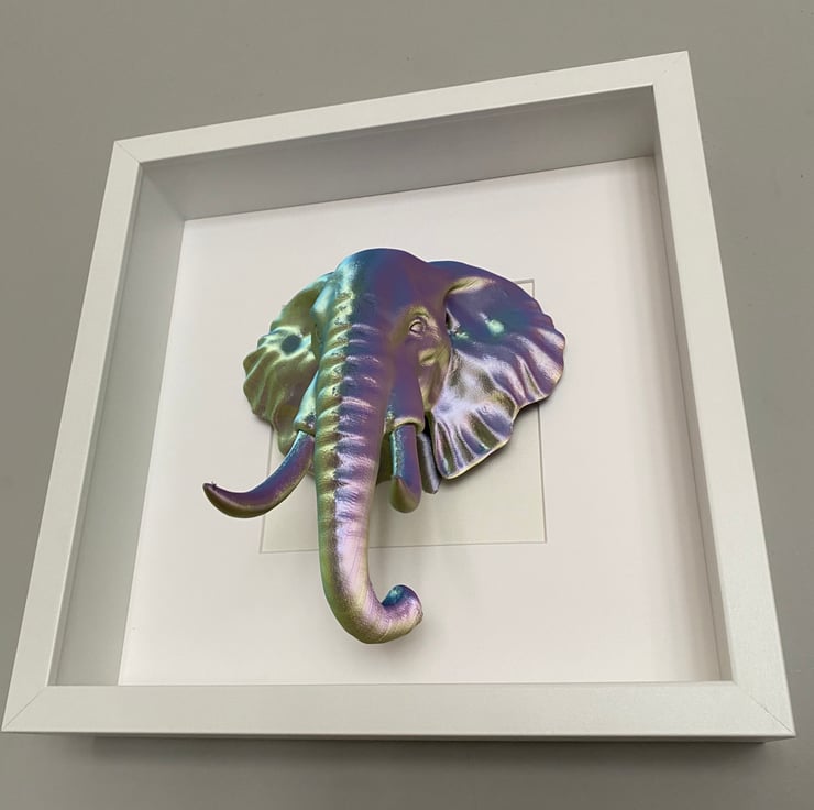 Elephant wall art in either black or white frame, elephant colours are a three tone gold/purple/green, size of the frame is 27cm square can either be wall mounted or displayed standing up.