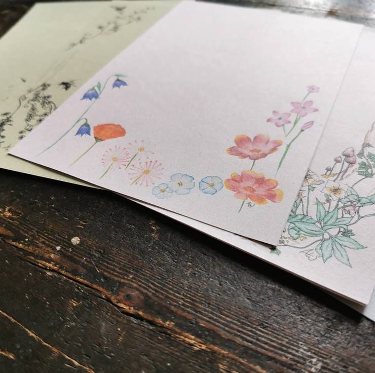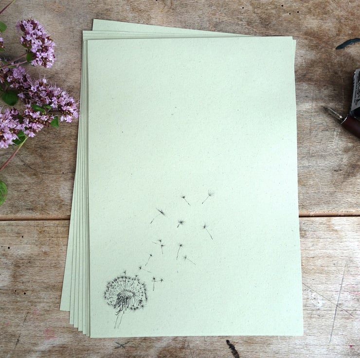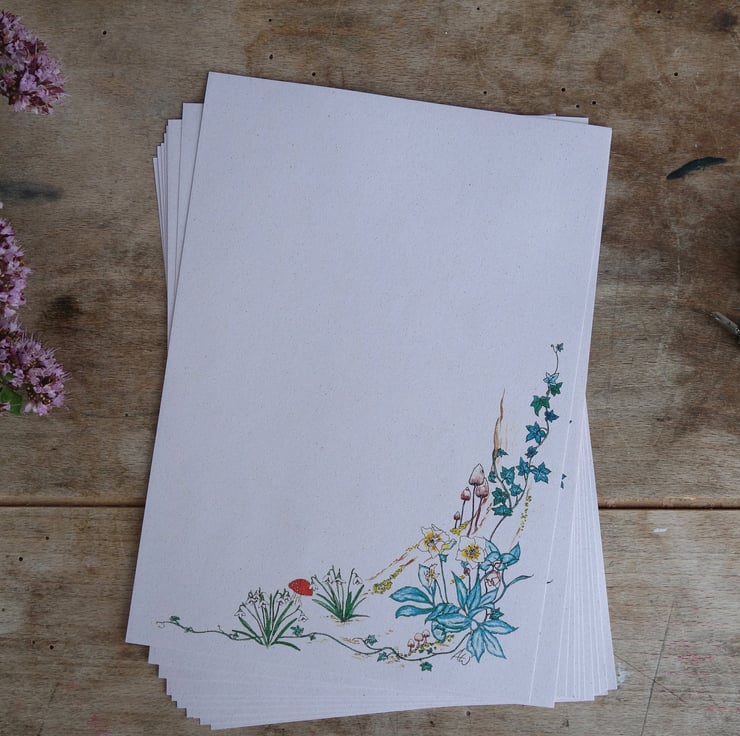 A selection of designs and colours of my letter writing paper printed with a variety of wildflower and woodland illustrations. There are 5 different designs in this selection printed on either green or pale pink paper, including dandelions, wild roses. The designs are prints of my pen & ink and watercolour illustrations, the photos show which different designs and colours are included in this selection pack. These sheets are ideal to top up your stationery or journaling supplies or to mix and match with the envelopes I also have available in my shop!