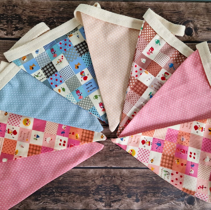 This beige, pink & blue fabric bunting comes in a standard length of 2 metres (plus a little extra for hanging), and incorporates 8 double sided flags. Each flag is 16cm long and 14cm wide.