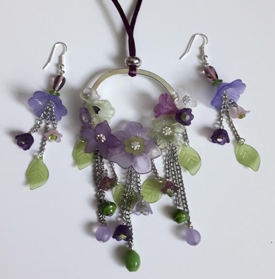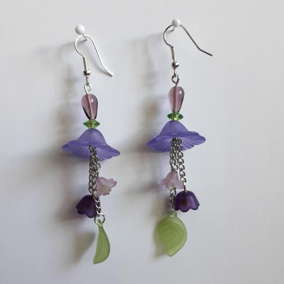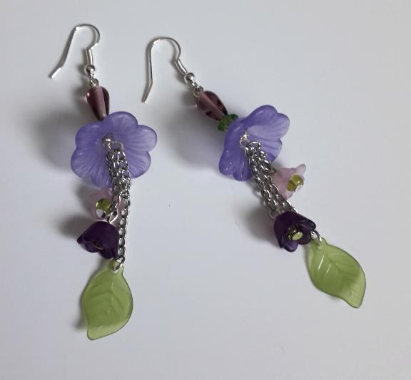 I have made them up with teardrop shaped glass beads and small green lice beads above a lilac flower which is 2cm diameter, underneath this flower suspended on silver plated chains are 2 small bell flowers and a green leaf.