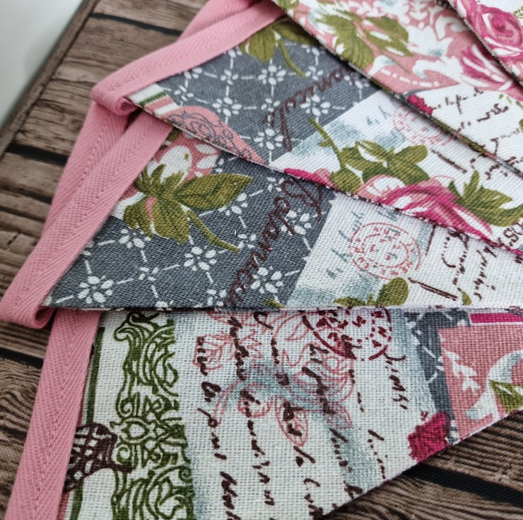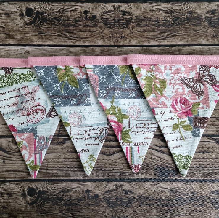 Shades of rose pink and grey, with butterflies and roses on a cotton/linen mix fabric.