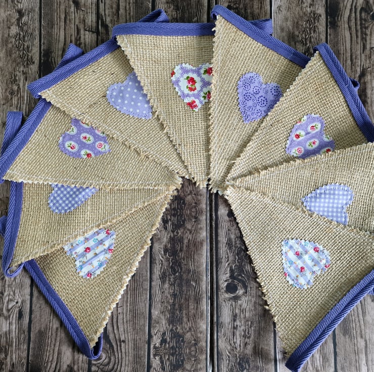 Each hessian flag has a floral/spot heart shape sewn on, with a purple colourway. The bunting tape is a deep purple.