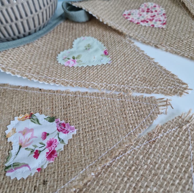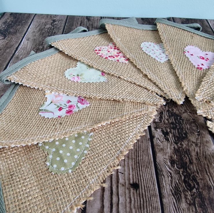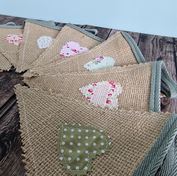 Each hessian flag has a floral/spotty heart shape sewn on, with a pink and green colourway. The bunting tape is a beautiful Sage colour.
