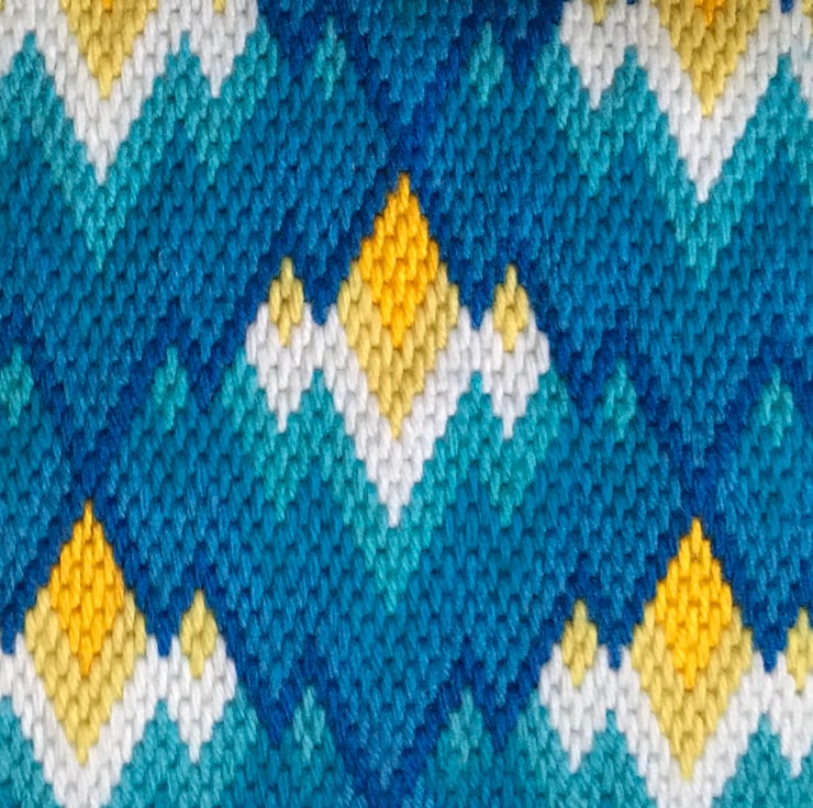 This Blue and yellow Bargello Needlepoint cushion is made in wool and acrylic yarn and I’ve used a pin-striped upholstery fabric for the envelope style back. It measures 43cm x 43cm (17ins x 17ins)