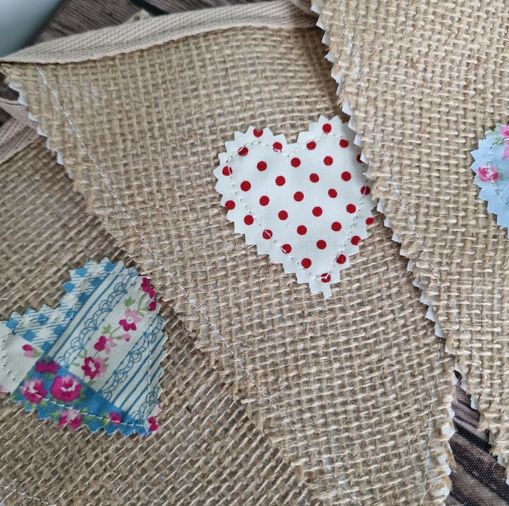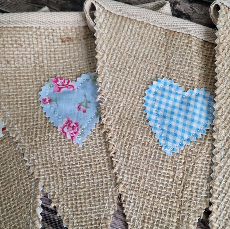 Each hessian flag has a spotty, floral and gingham heart shape sewn on, with a blue and red colourway.