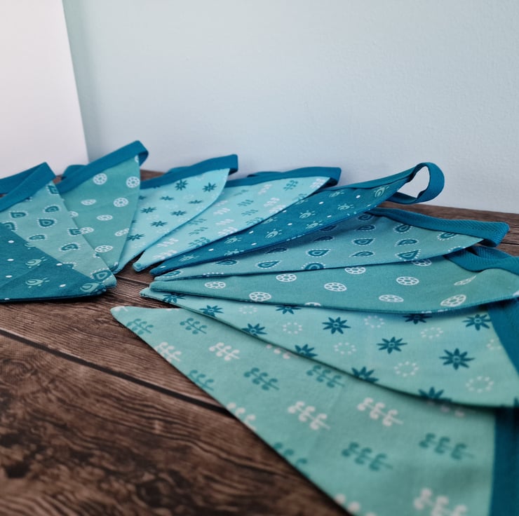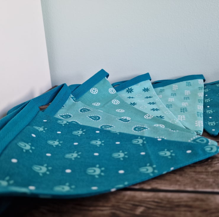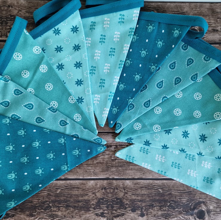 This teal blue shades mix fabric bunting comes in a standard length of 2.5 metres, and incorporates 10 double sided flags. Each flag is 16cm long and 14cm wide.
