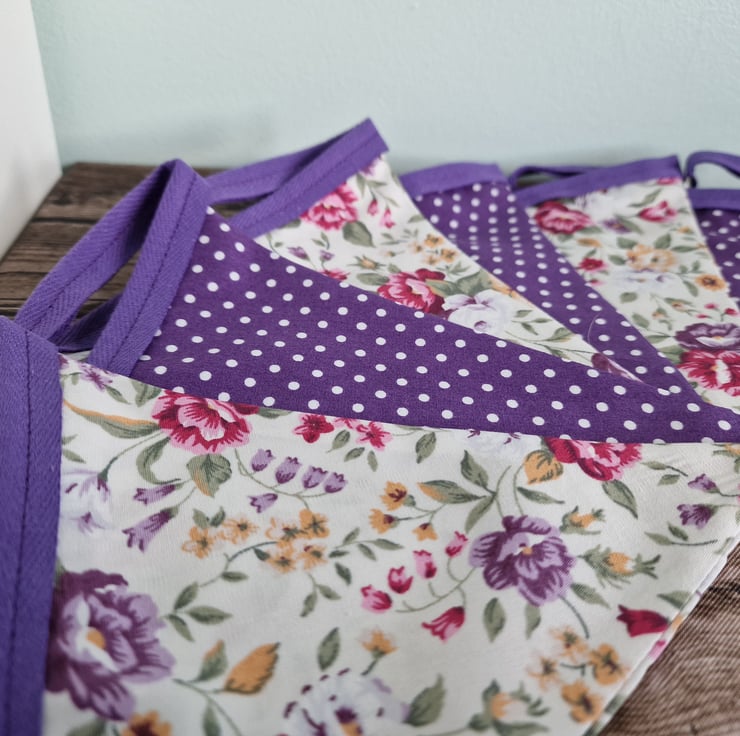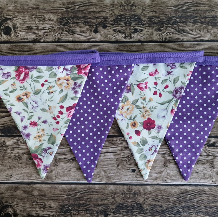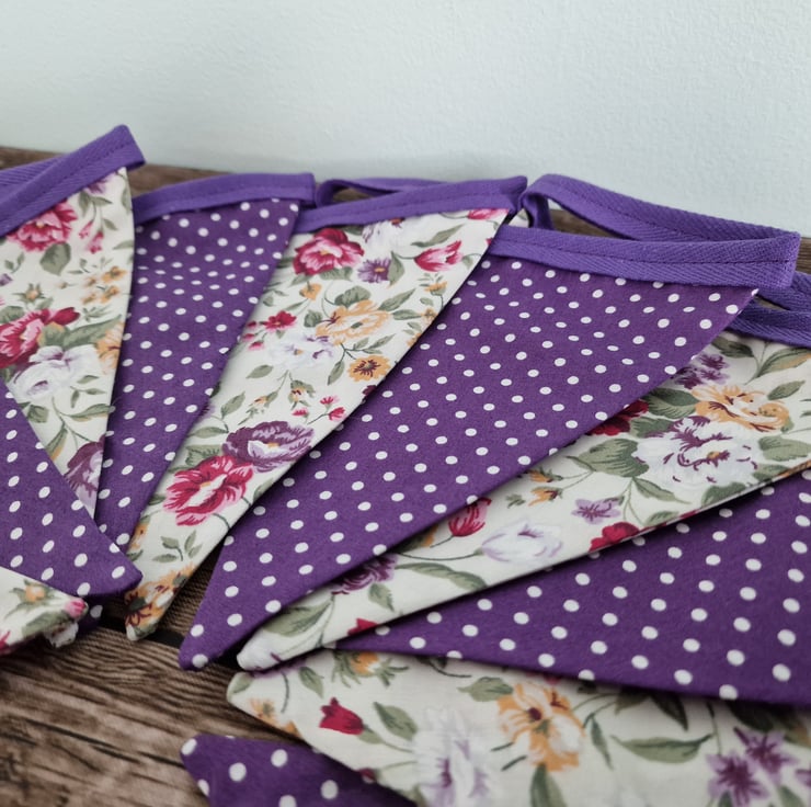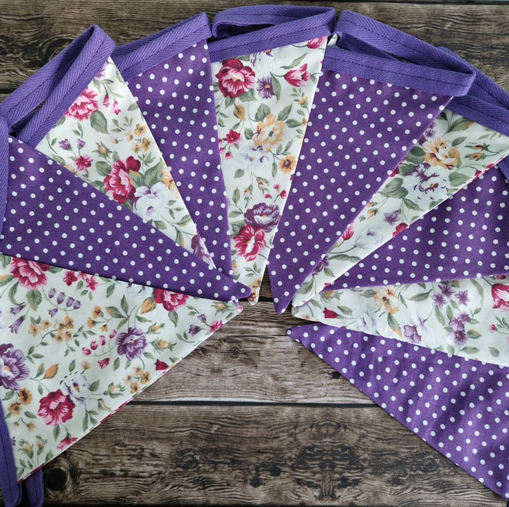 This gorgeous, brightly coloured vintage style floral bunting comes in a standard length of 2.5 metres, and incorporates 10 double sided flags. Each flag is 16cm long and 14cm wide. The flags are made from a cream wild spring flower fabric, alternating with a purple polka dot fabric.